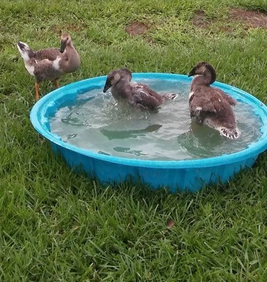 I haven't added any frozen bottles to my small gosling pool yet, but I'm home and change the water for them midday so that it is cool and refreshing. Plus, here in FL it has been raining a LOT, and the goslings seem to like it. They go about their business mowing the lawn in it, and sometimes I catch them under the eves playing in the drips.
