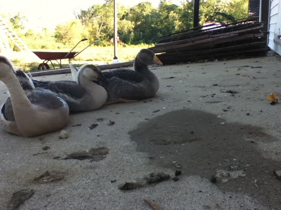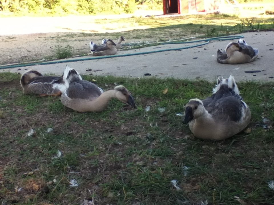 The resting geese: from front left to right: Sissy, Percy and Fred. In Back, Left to right. Ron, Sweet Pea and George. Yeah, we named a lot of the flock after the Weasley Family from Harry Potter. Not that we know what sex any of them are, of course. Fred was the one we found backside up about a month ago. He's a bit unsteady on his feet still, but keeps up with the flock.