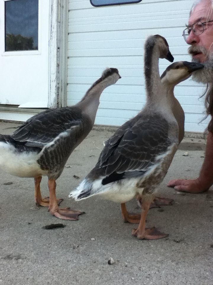 I have two brown Chinese geese named Hot Head and Big Guy! The story behind Hot Head's name is that when she was maybe 2 weeks old, they thought that their heat lamp was very interesting! You can probably see where this is going but they managed to break it and Hot Head had a bald spot on her head!They were all ok though.