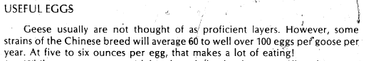 Ninya & Charlie have grown into a beautiful (and handsome) pair of geese. Congratulations on the eggs! Mine layed about 12 in October (I think it was Oct) and then stopped. I'm going to see if I can find how many eggs the breed usually lays in The Book of Geese - i think I remember seeing it there.. it just takes a while to load on my computer. My goose hasn't started laying again, but her little pouch between her legs has dropped, so I think she'll be laying again soon.