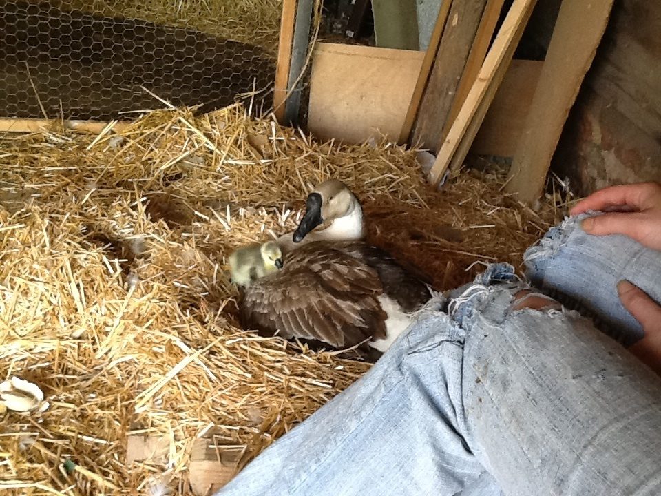 well Sissy our one-eyed gal is a Mom! That is the first gosling next to her. She has another under her wing, and one more hatching. We're so excited for her!