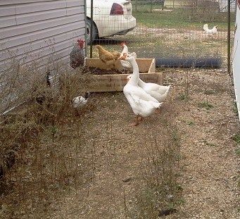 I finally found a Beau for Miz Claire Booth Goose.... He's an 8 year old, been the odd man out among 4 mated pairs.. and was picked on a bit by the biggest gander.. his left wing is deformed... so when I got him home, I took scissors to the wing tip feathers that stuck straight out from his side when he folded his wing... now he doesn't catch on so many things...