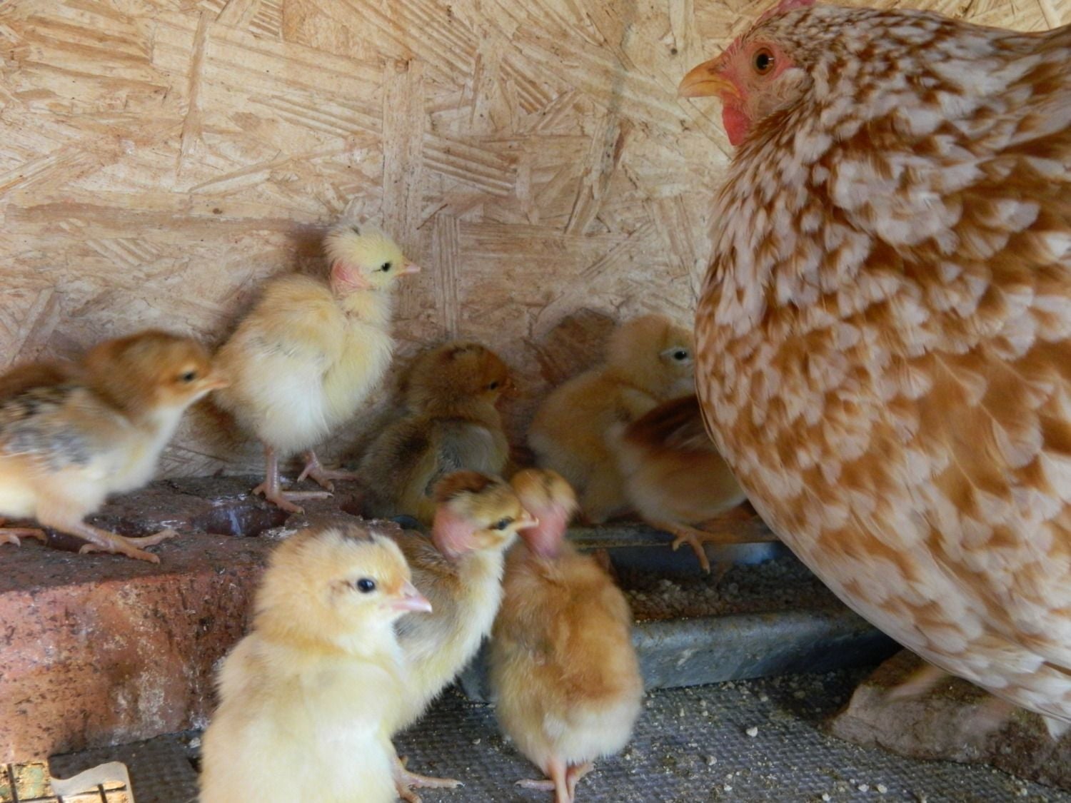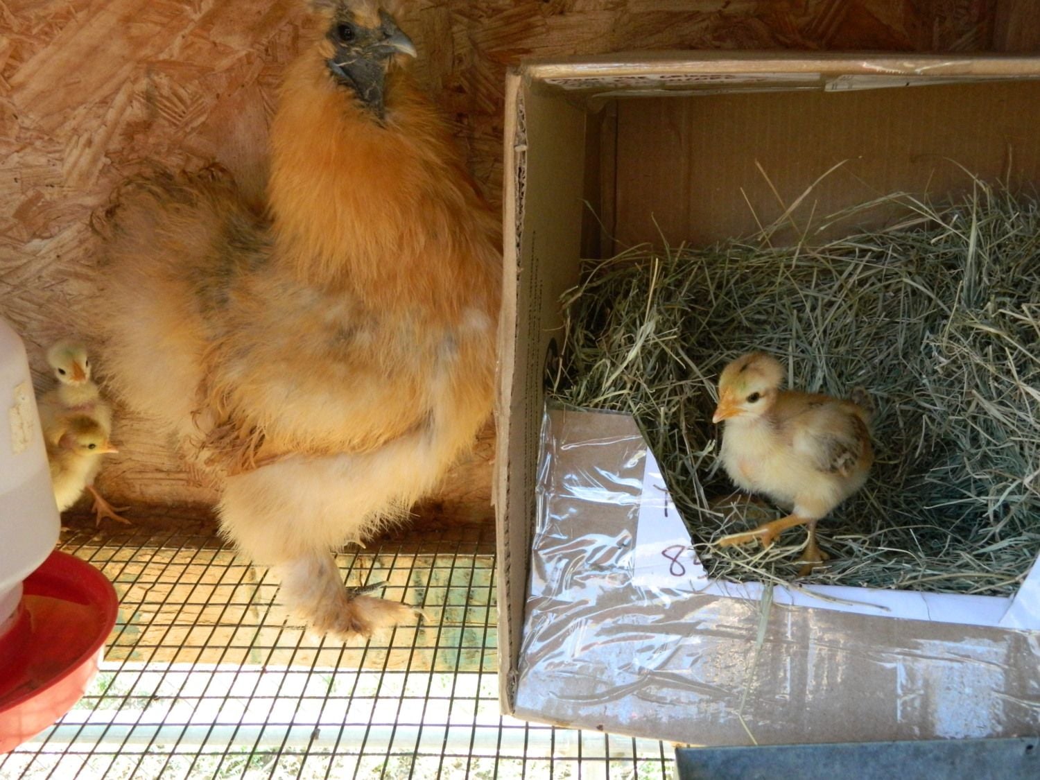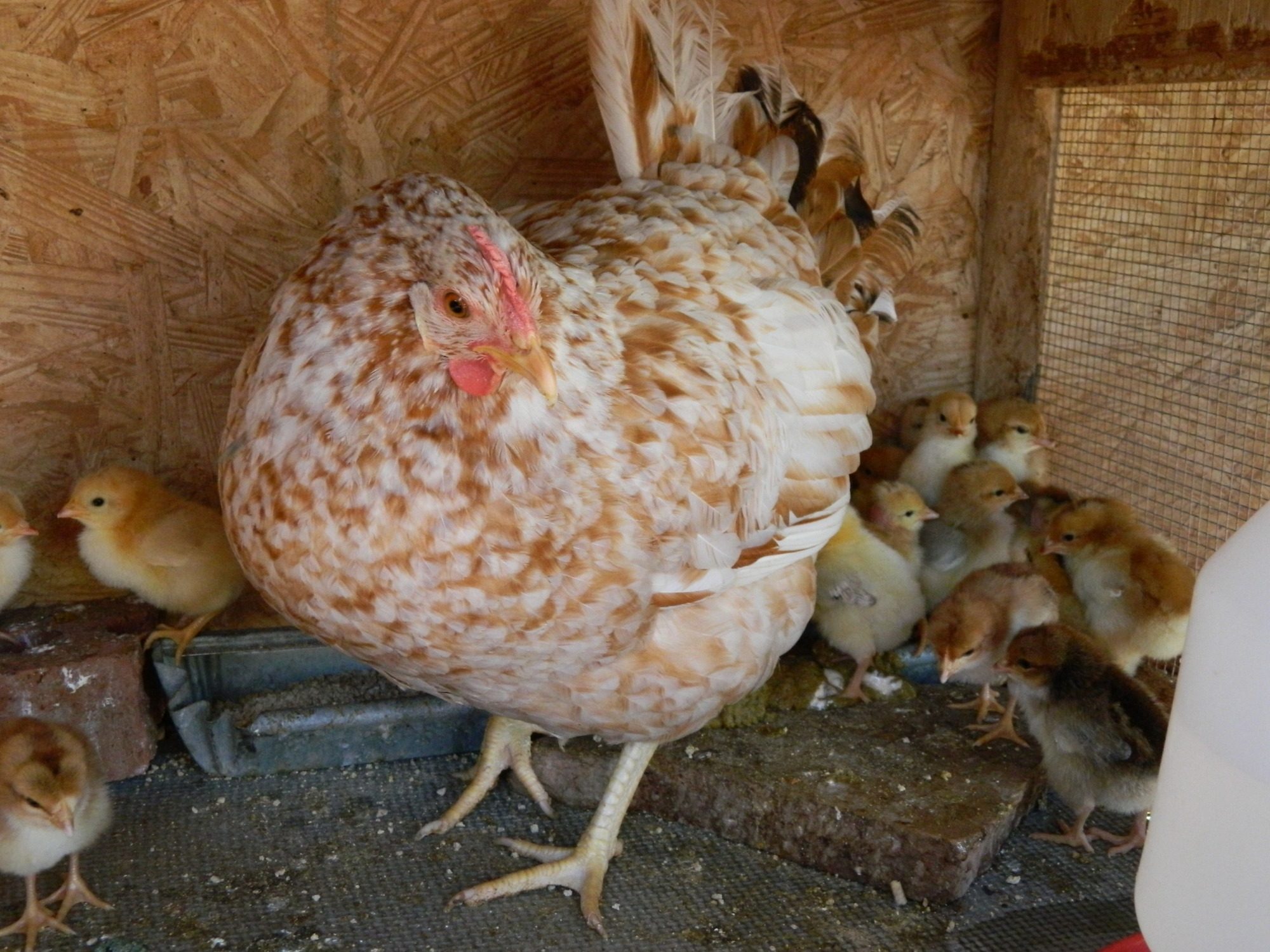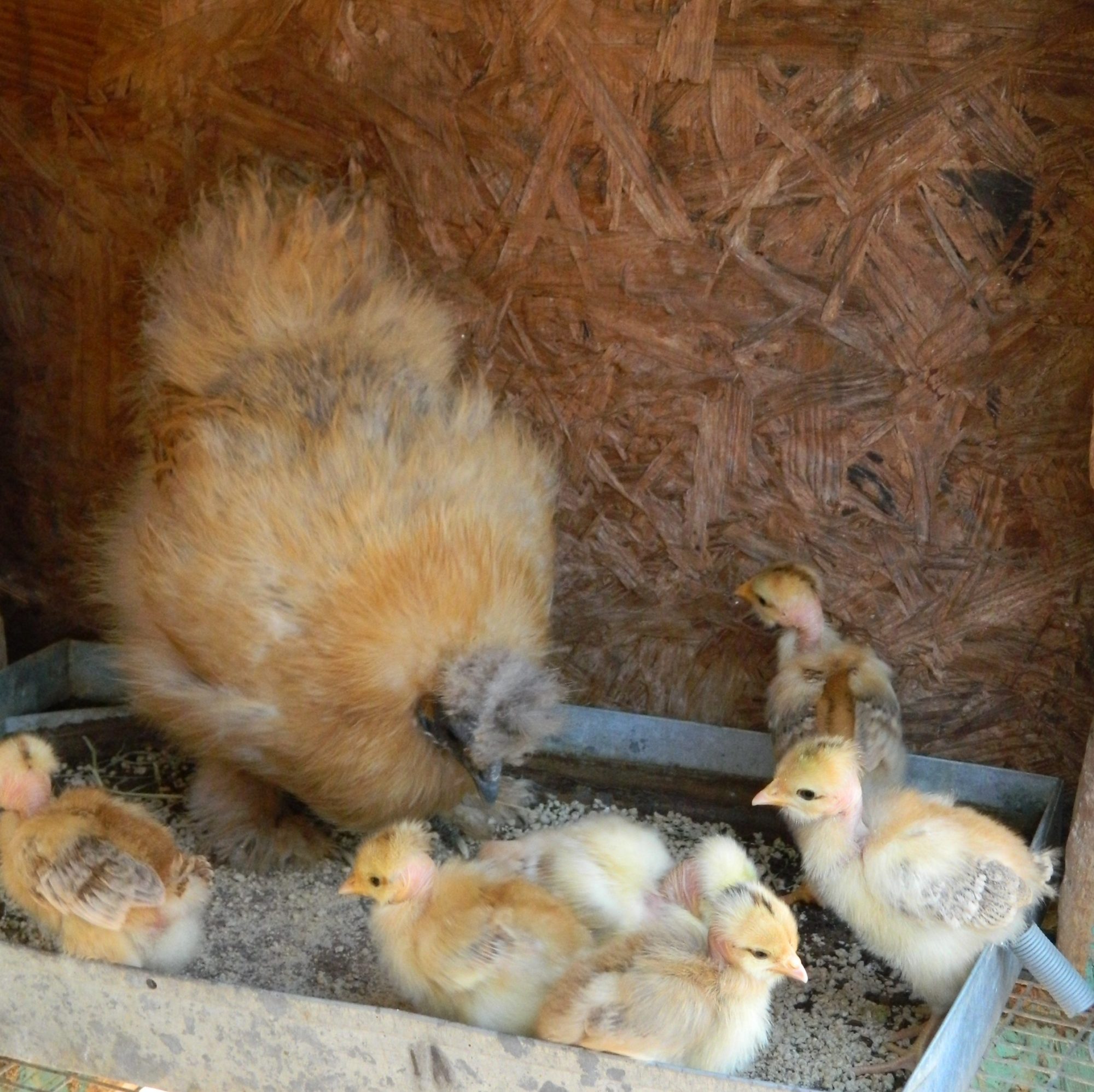 I was so disappointed that I stuck some of my hatched chicks under two broodies. One is a Silkie. Silkies are pets, not part of the program, so perfect chick-mom for "foster chicks". I gave her six Naked Neck Aloha chicks to raise.