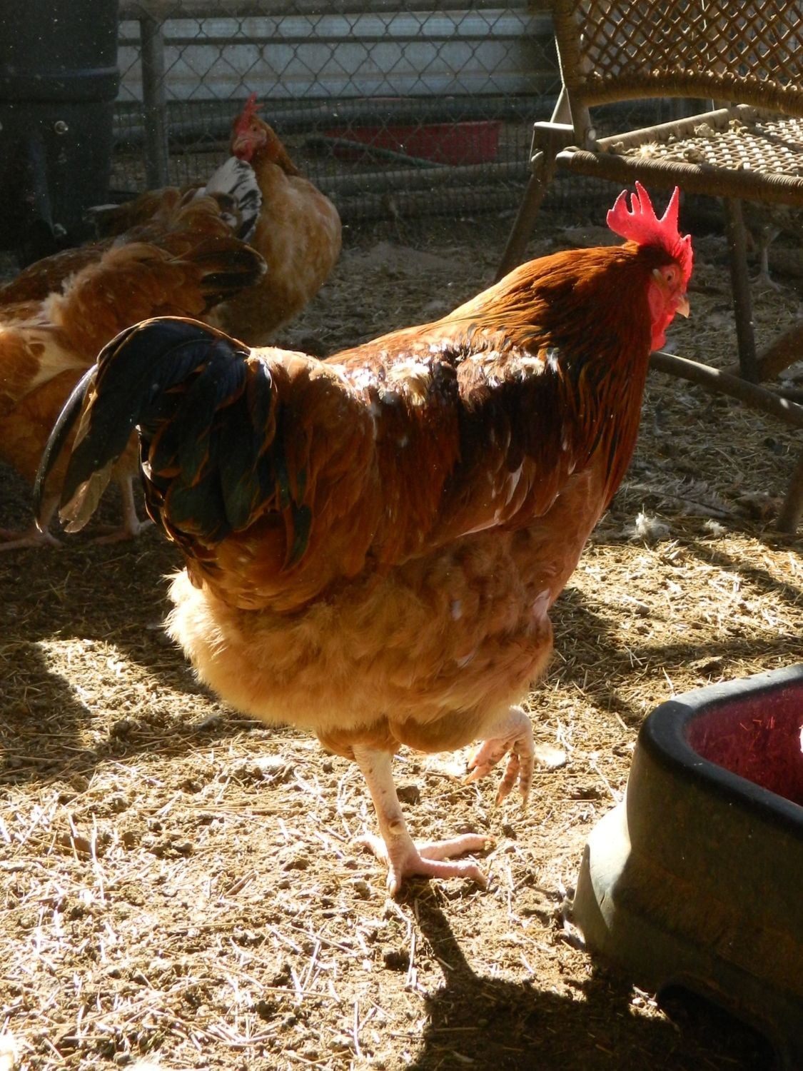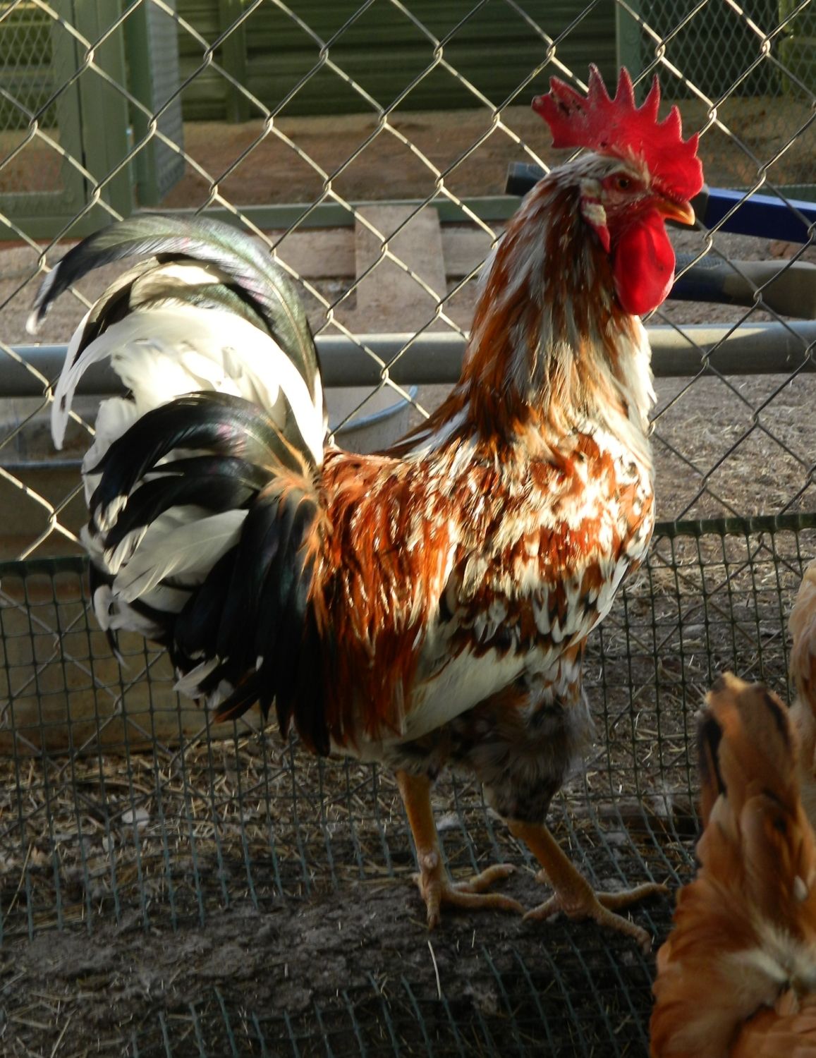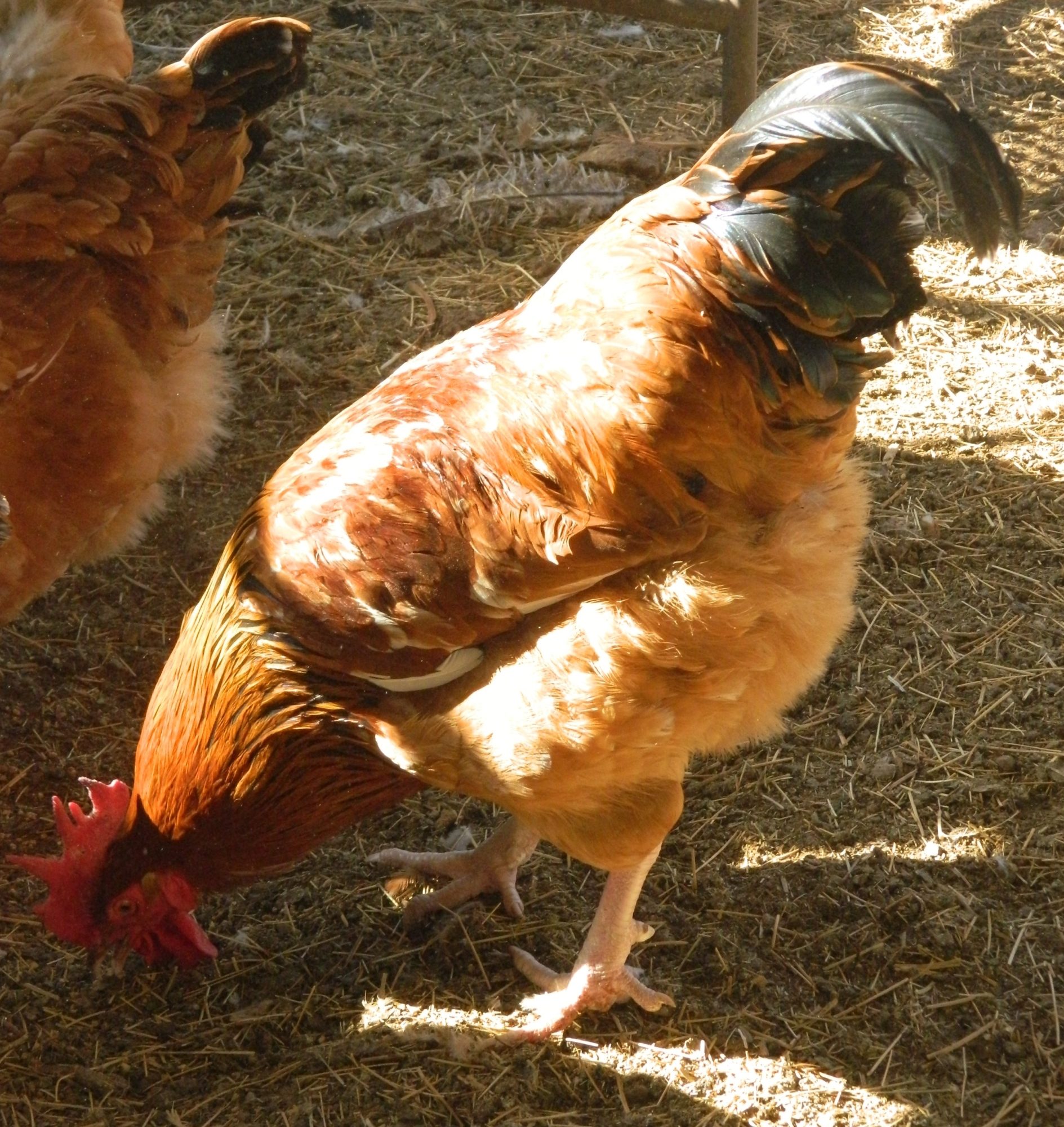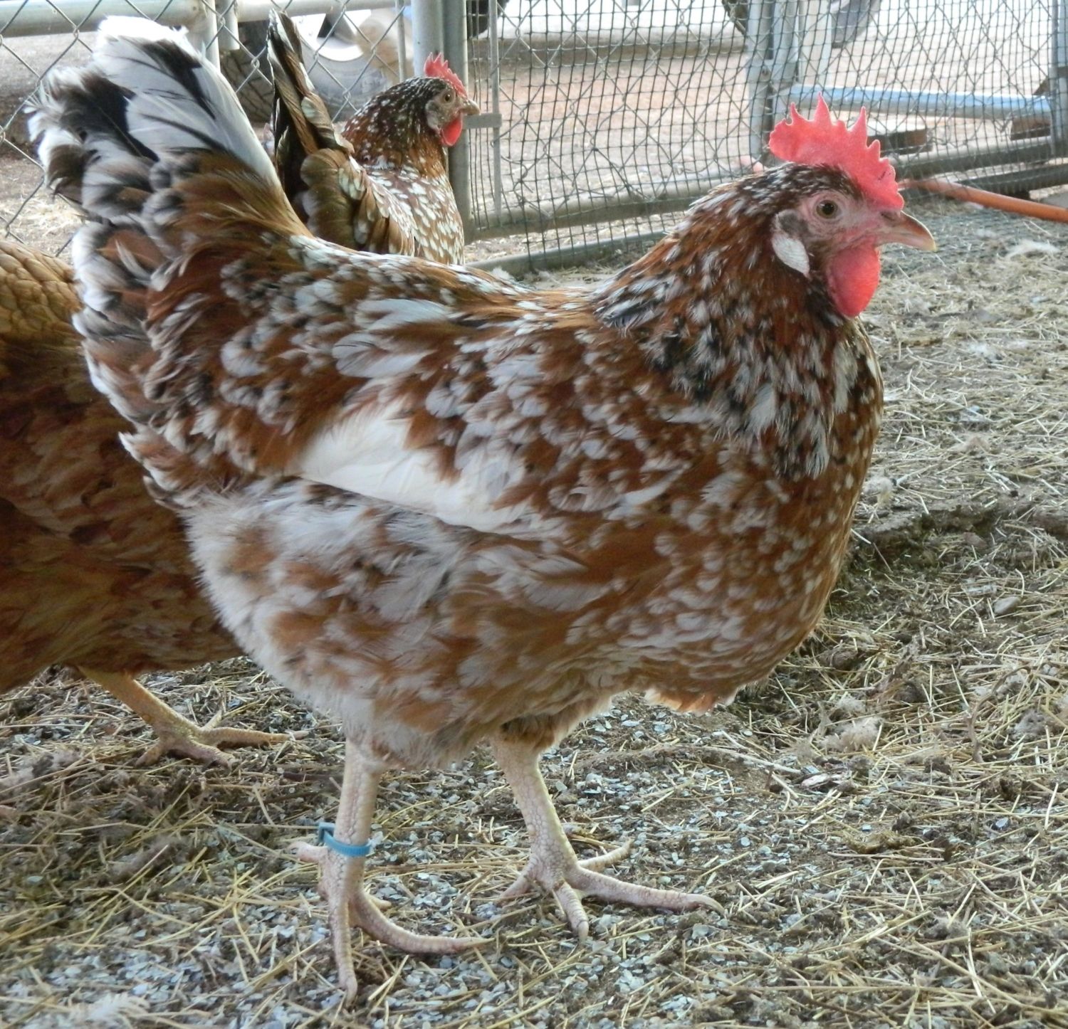 Not sure if this is the same hen or two different ones? There are a few like this with nice body type and excellent size, but not the crazy-flashy color. Nice - but no yellow legs, and no excessive white. Currently in evaluation. Their final size will probably determine if they stay or go. One is very sweet and lets me pet her.