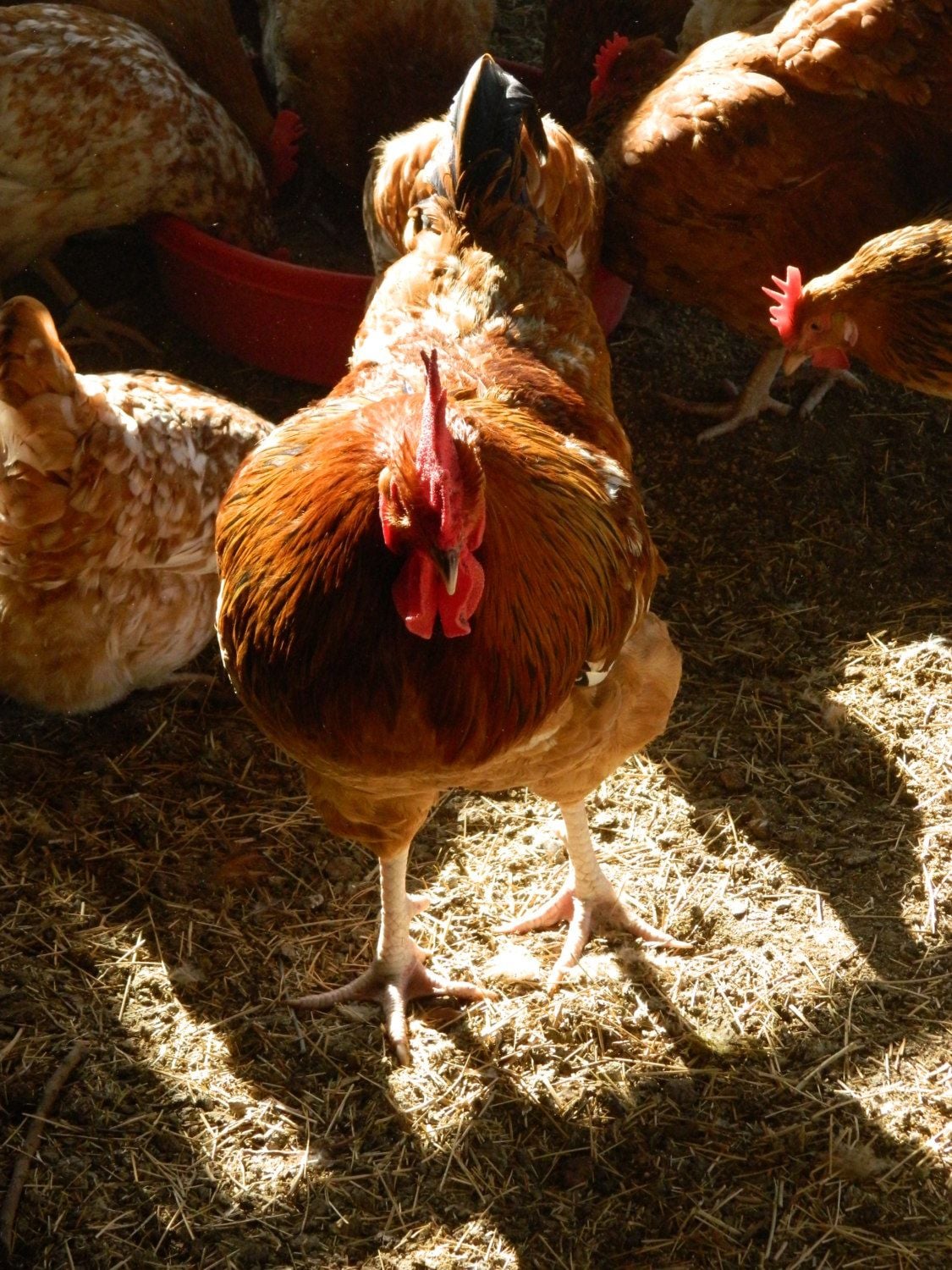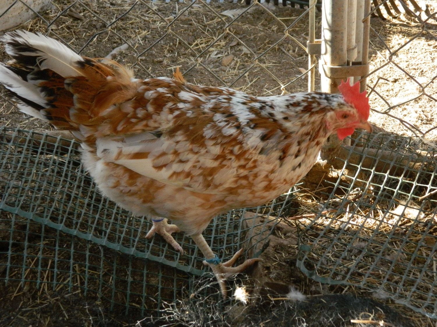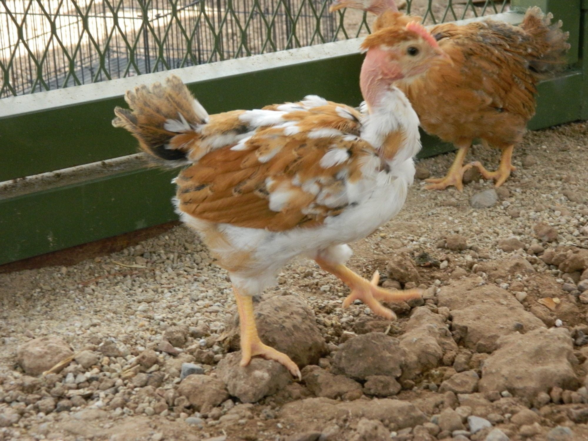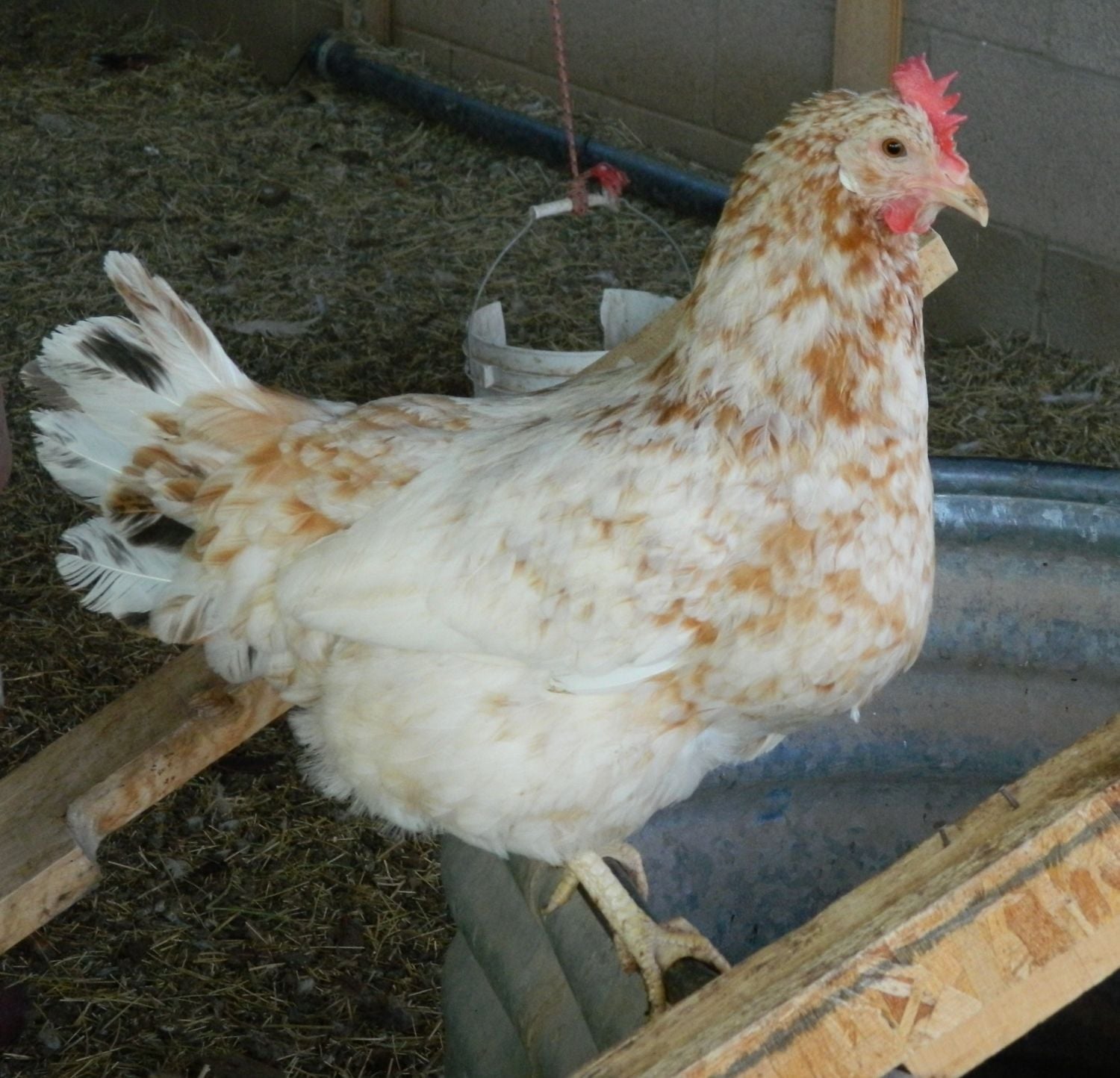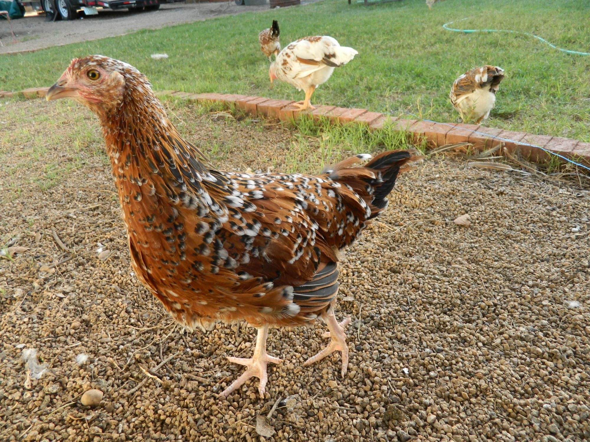 Not sure if this is the same hen or two different ones? There are a few like this with nice body type and excellent size, but not the crazy-flashy color. Nice - but no yellow legs, and no excessive white. Currently in evaluation. Their final size will probably determine if they stay or go. One is very sweet and lets me pet her.