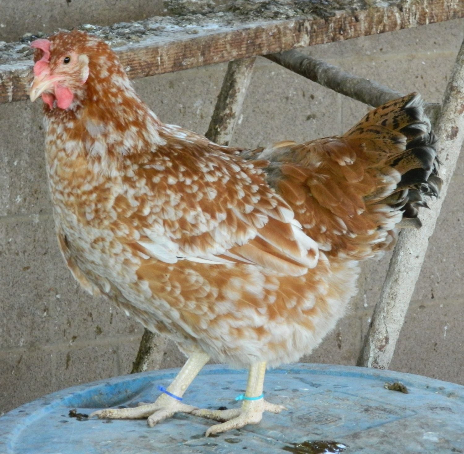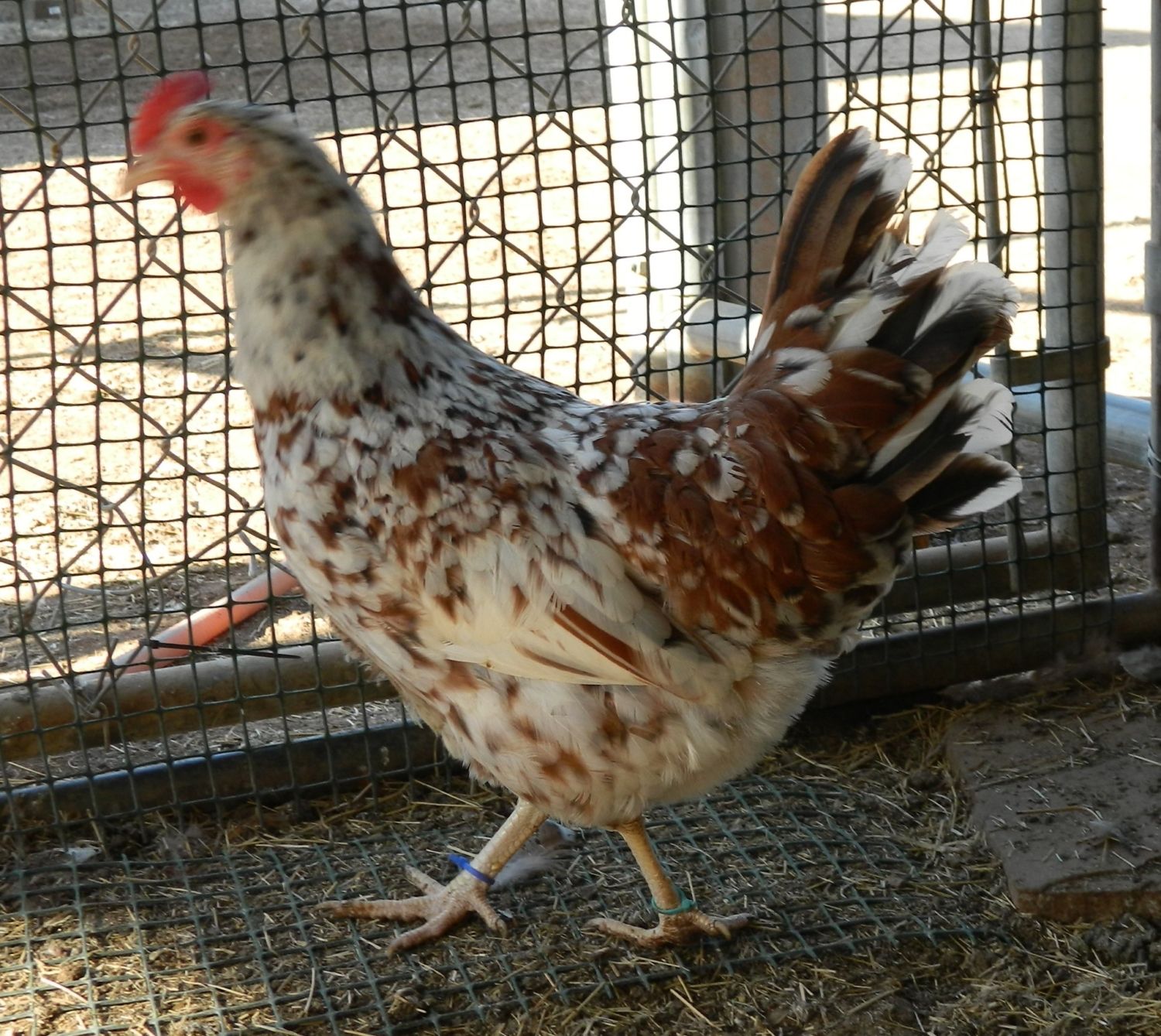 I'm sharing these pictures mostly for Deefield, as I'm going to send her some hatching eggs with the purpose of getting something with good spotting, plus YELLOW LEGS to cross with her Buff Sussex / Speckled Sussex "large" size stock. However, the Sussex don't have the yellow leg gene. But we don't want something ridiculously small, either - so most of my teeny tiny super flashy girls are out.