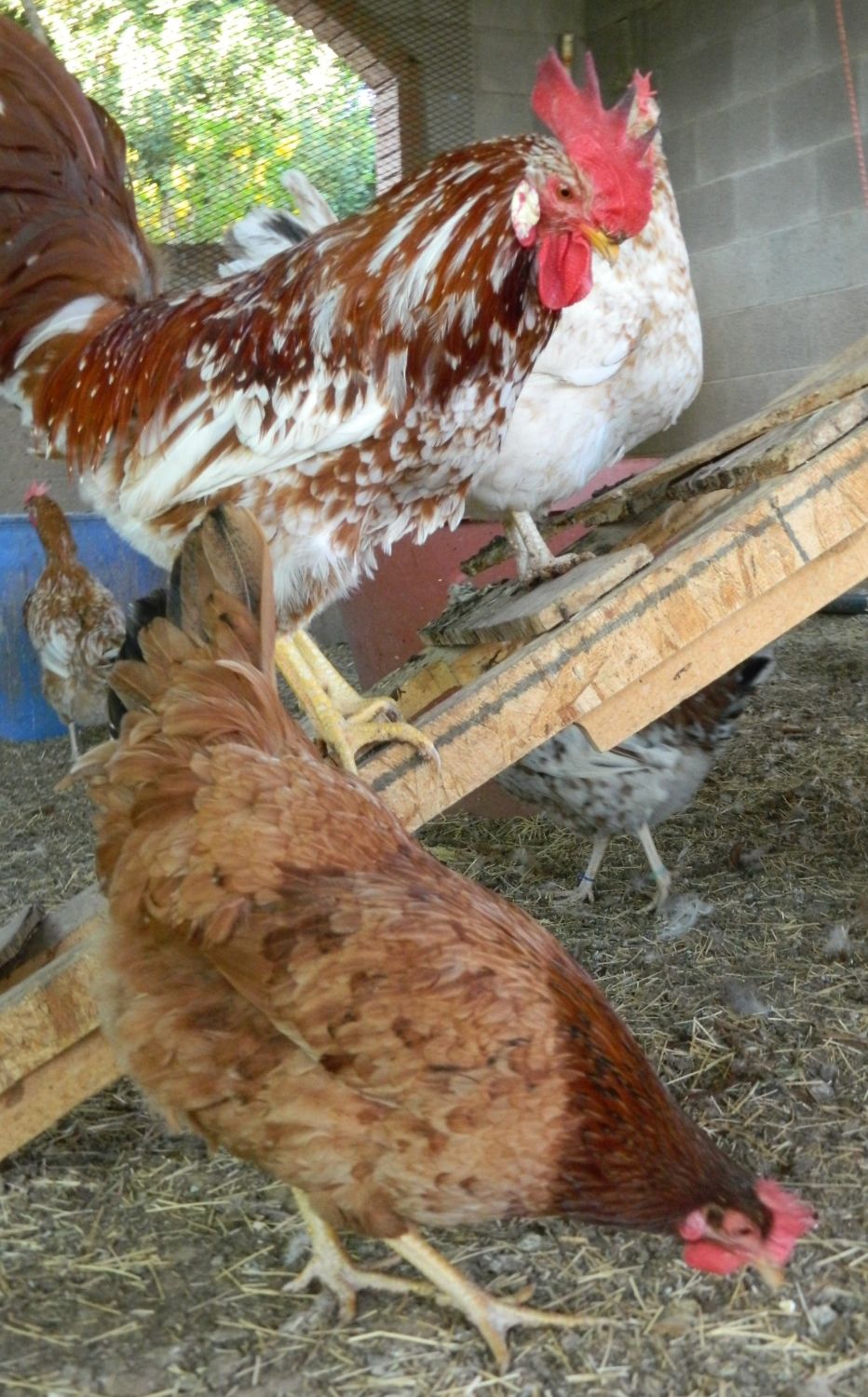 This is a different boy in this photo - would be lovely to cross these together and send the babies from THAT cross to HEChicken? The spotty rooster looking down on the hen in this photo, is almost exactly like an Exchequer Leghorn but in red and white. A spotted rooster cross between these two would mix beautifully with HEChicken's NHR x Exchequer cross hens, and would also mix nicely with heritage NHR's. This line could possibly make red & white mottled NHR's in no time flat. ;)