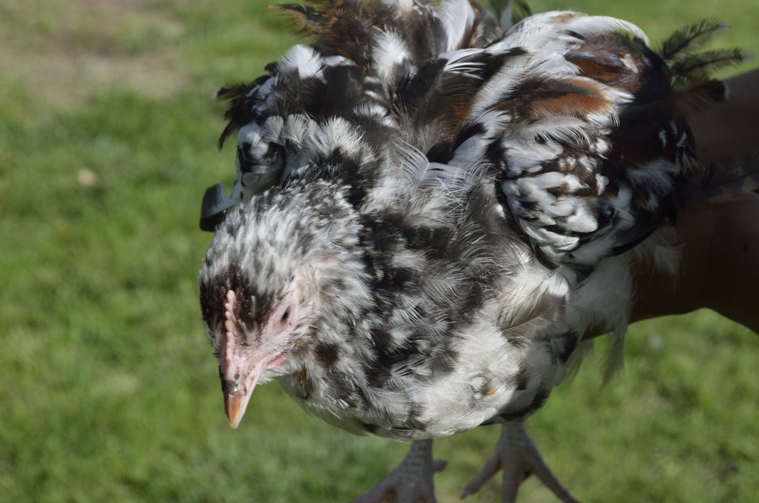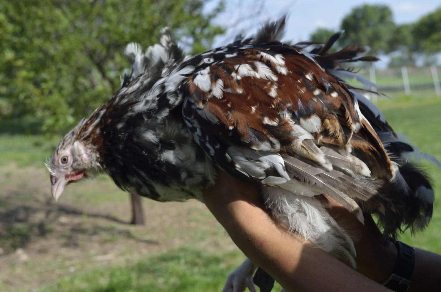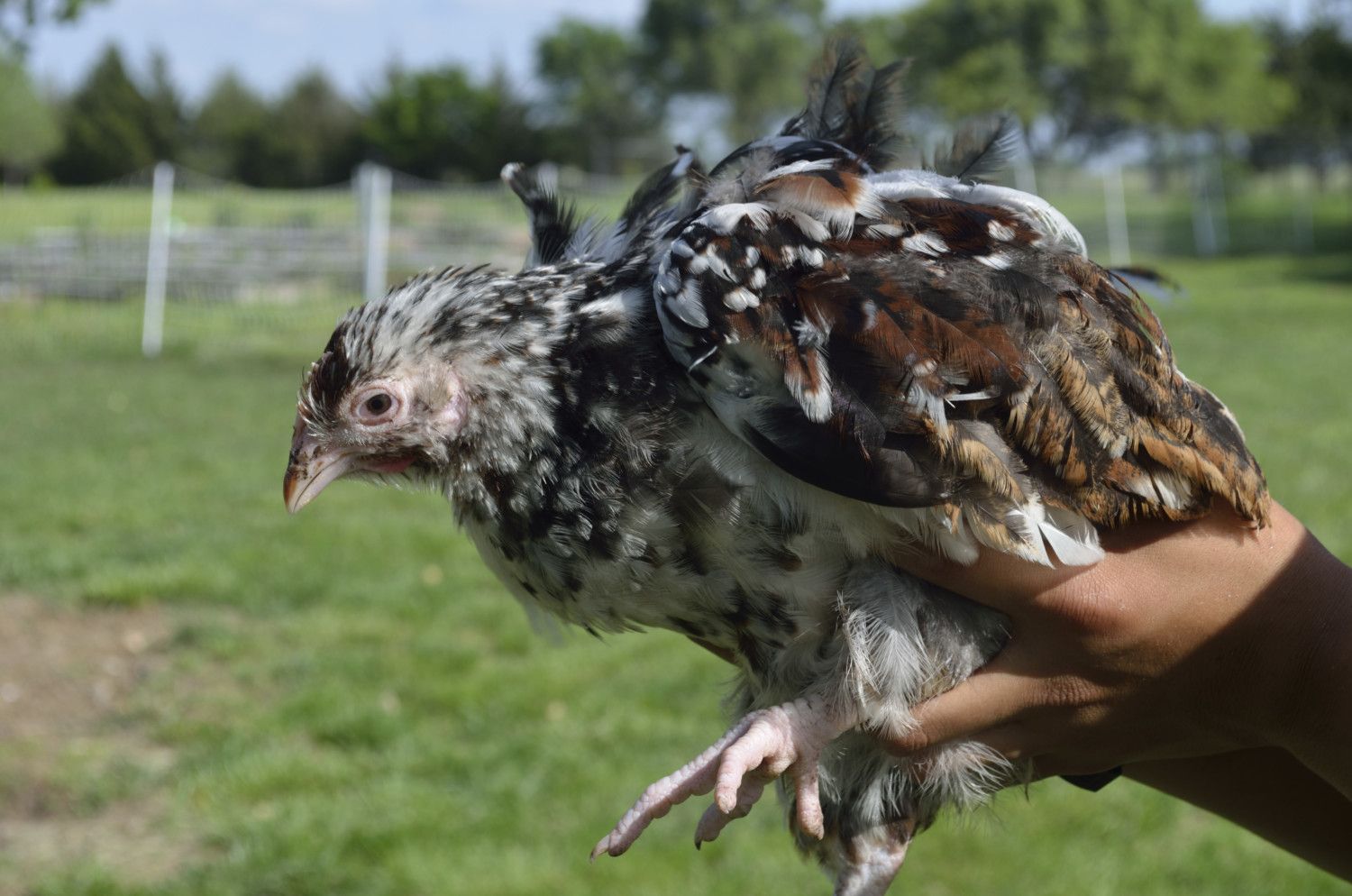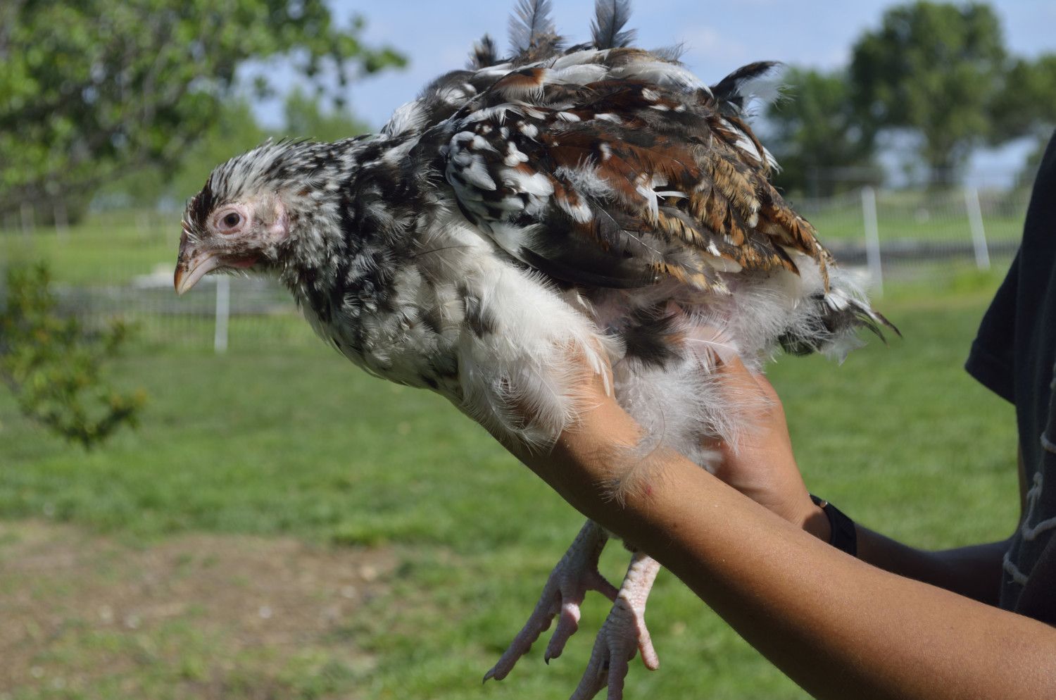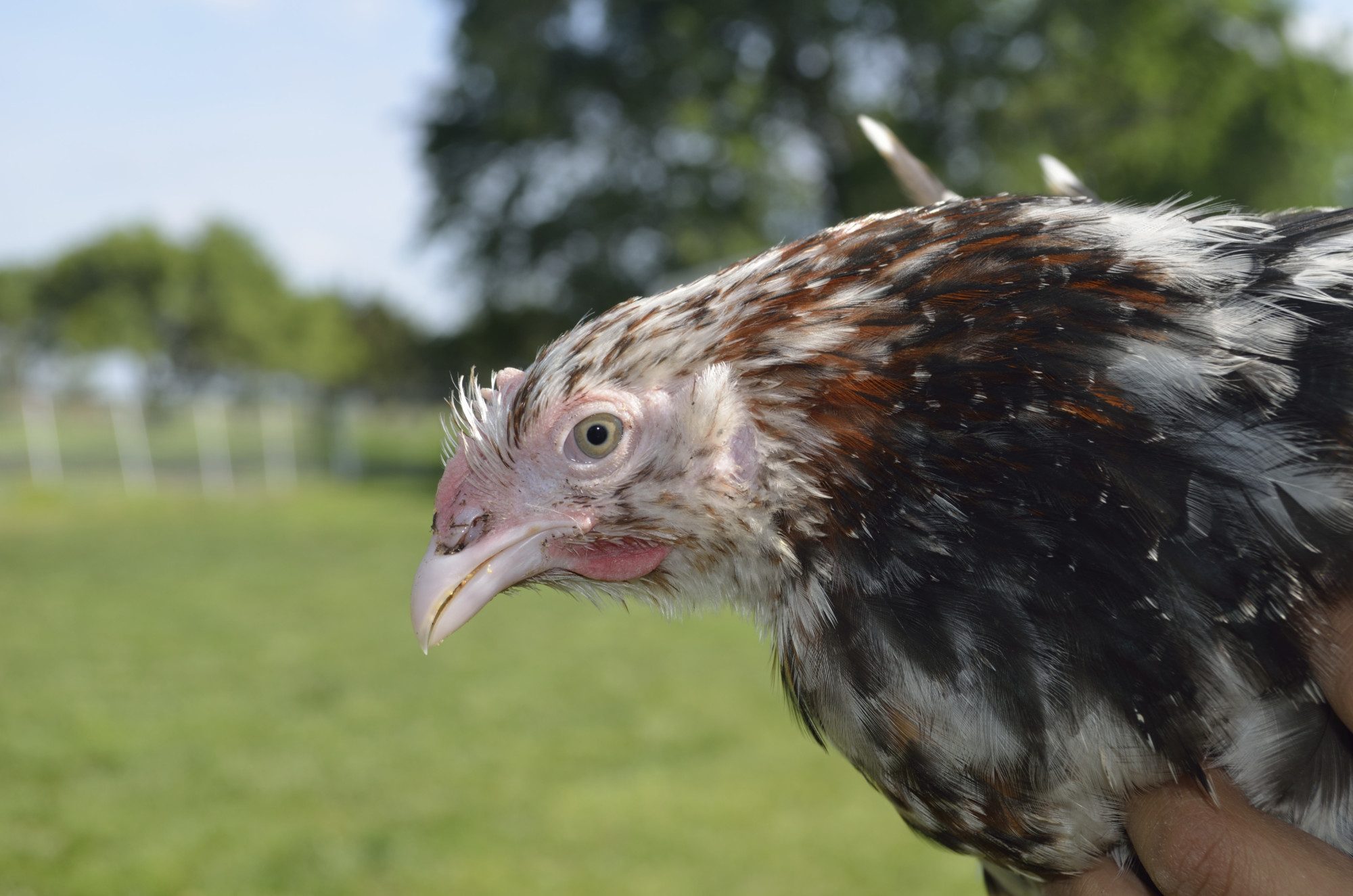 His parents were both sibling/ half siblings if my Salmon naked Neck rooster. I saw a picture of his dad and he was solid red and there were several hens in the bunch so it could have been any of them as mom. Which being by Salmon Boy could have been carrying the mottling. Any way I lucked into some more chickens for the Aloha Naked Neck program.