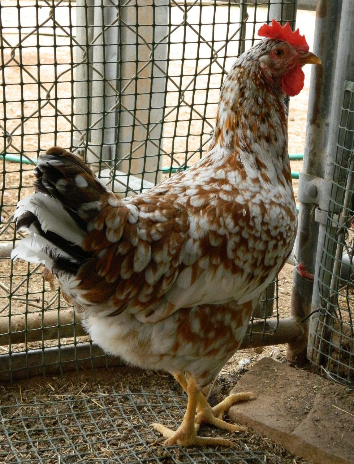 Above: This hen has gorgeous color and tons of white! She is tall, but is a little lanky in build. I think when crossed back to Sussex lines, her babies could be awesome, though.