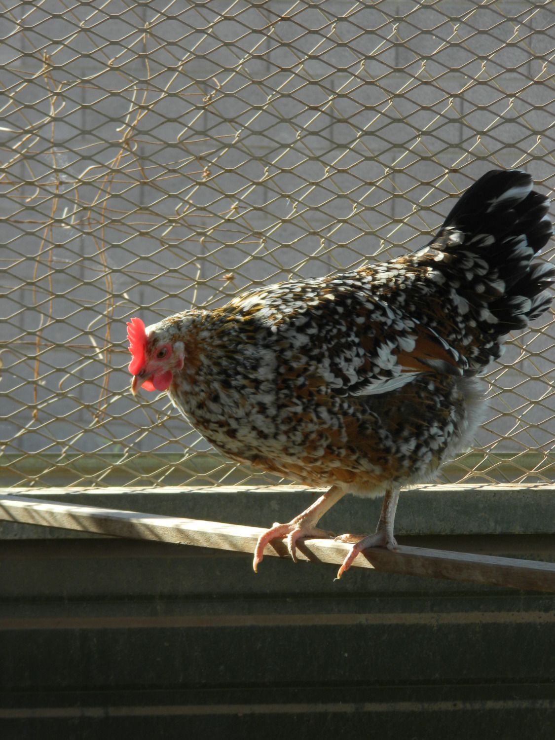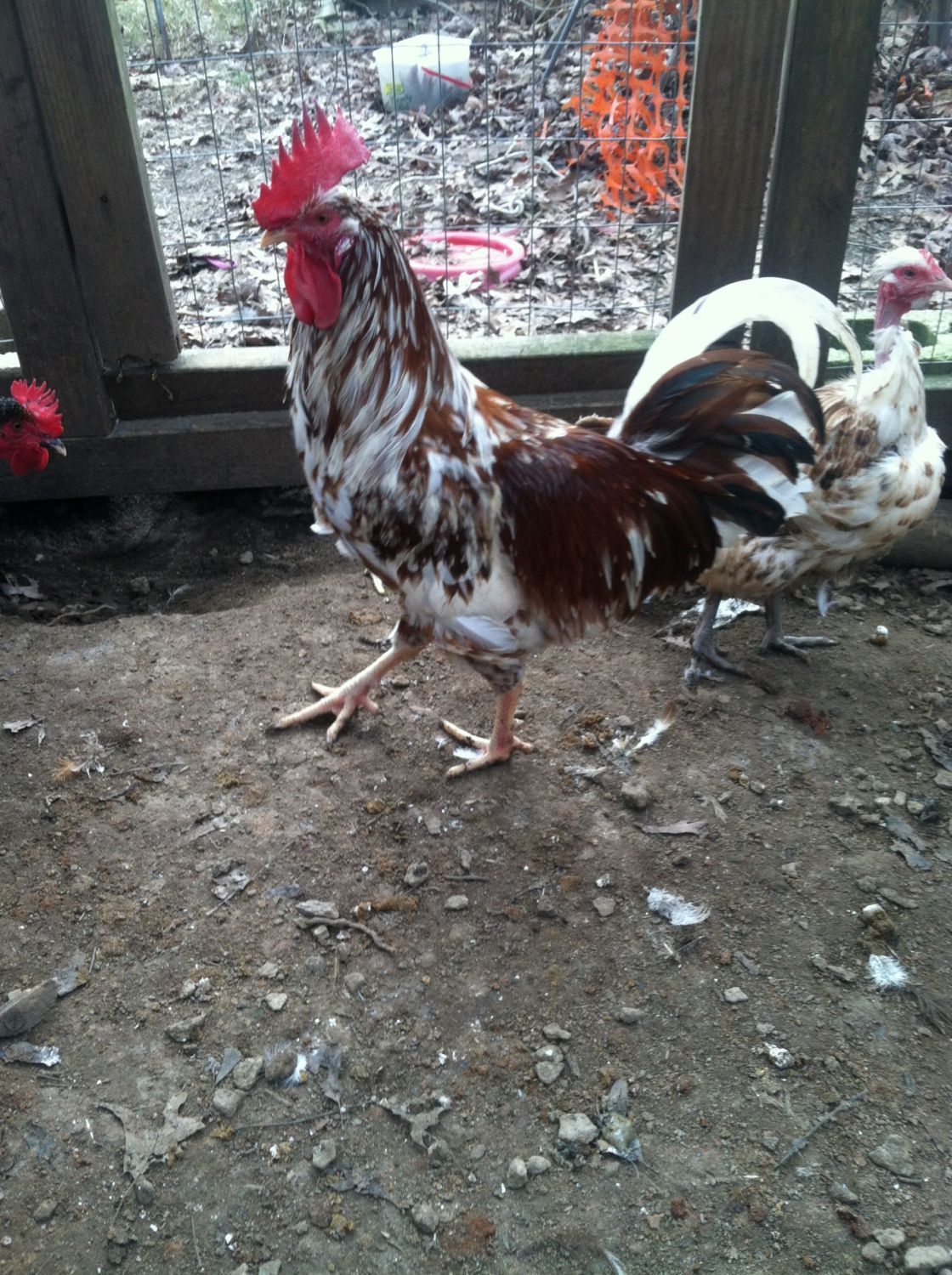 Speckled Sussex are born with a white chest like this, and then the color "spreads" out to beautiful spotting at four months old. I can't wait to see how this chick turns out! And - YELLOW LEGS. This rooster has not let me down with the yellow leg gene.