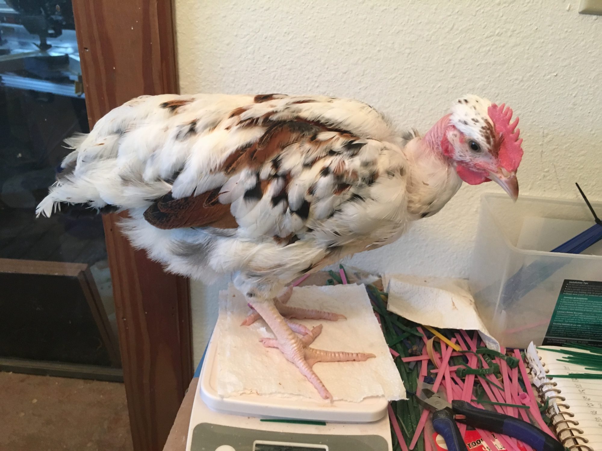 Can't sleep, worried about growouts and housing, so I got up and started looking at data and photos (today was the Aloha weight and photo day - week 8). I am going to need to do an early cull of some of the boys I know I am not keeping (fully feathered or tiny, and in one case, a biter), so that I can better manage their housing. Here are the main contenders to keep - will likely only keep one or possibly two. @alohachickens - can you comment on the feathering and give your opinion? The boy with the dun is still the sweetest and biggest (at 40.42oz at 8 weeks), and he's definitely a keeper. He tends to sit on the scale, but has yellow legs: This is #2 (yellow leg): This is #3 (yellow leg): This is #4 (white leg, second largest behind Pretty Boy): These two are possible reserves (may let them grow a bit more before culling): Any comments? - Ant Farm