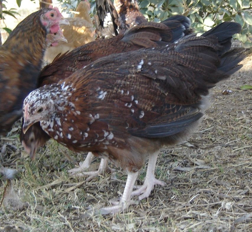 A dark chicken with little white dots. You'd probably call her "a brown hen with white dots"