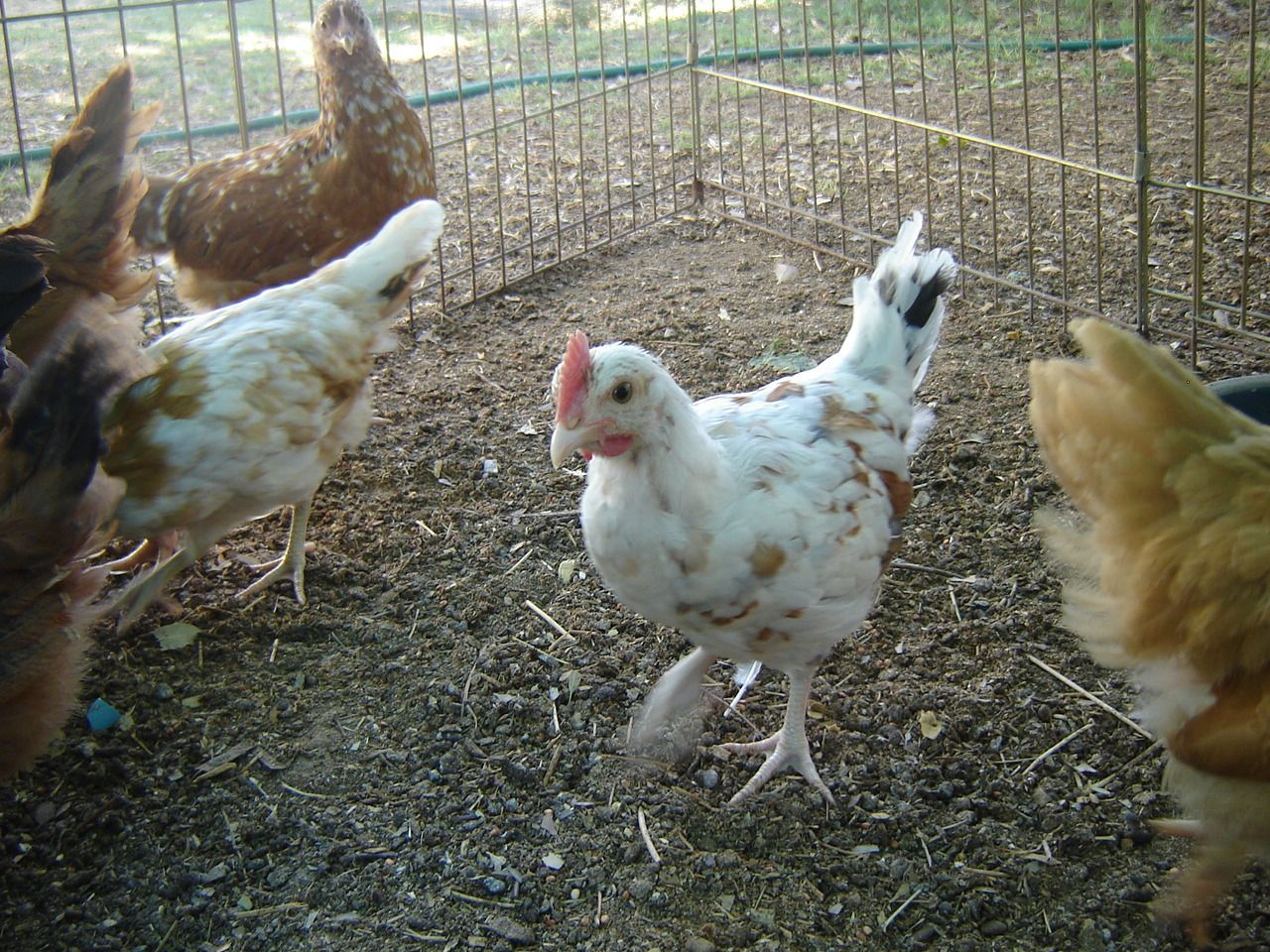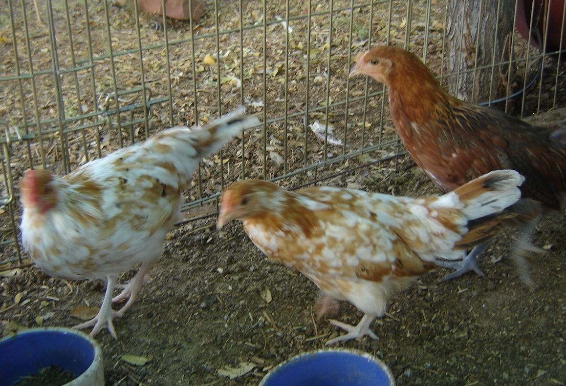 Cheeto's three spotted sons are having the same "color fade" issues as some of the previous roosters - the white is just starting to disappear. I am still going to use at least two of these roosters, however. The spots may be fading but the body type and size is still going strong.