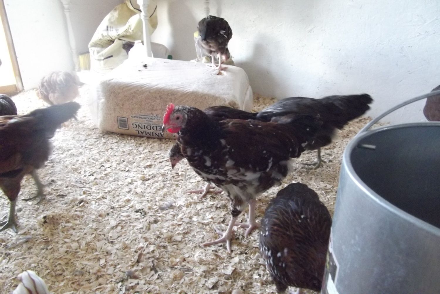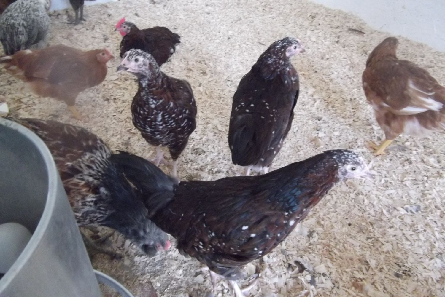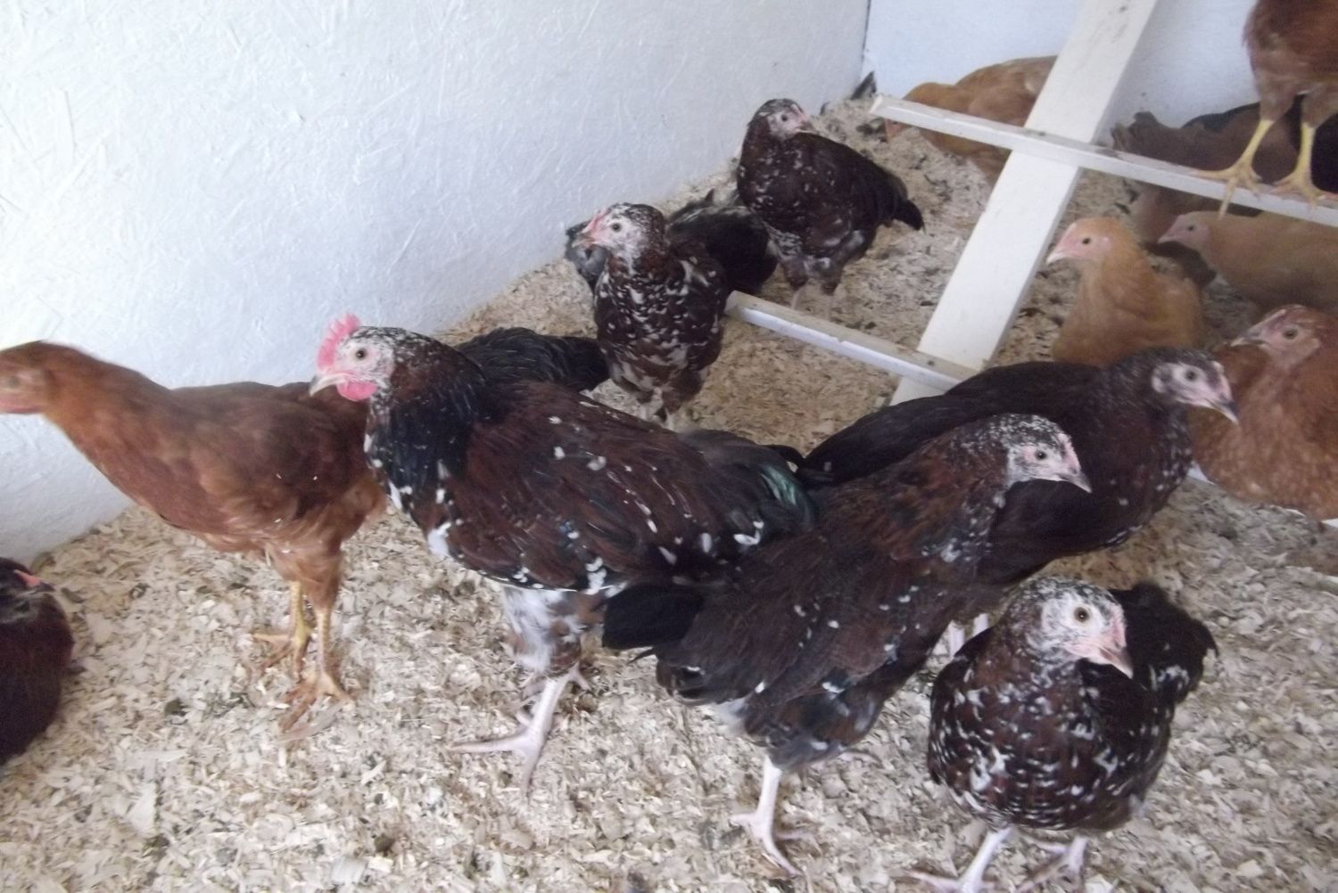 Overall, Roo #2 has the most white and there is one other roo that could be his twin. The girls are more spotty than shows up in the pic with only the larger spots showing but they are coming along. The pullet in the lower center has tons of white coming in from her head to shoulders but it's really small and doesn't show up in the photo. I need a better camera! Or a better operator, not sure which but have some idea.