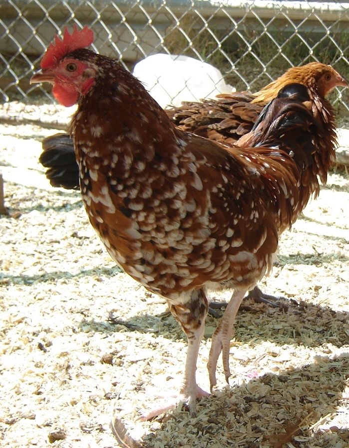 But the next photos showing that spotted hen, she looks like she has the less "gamey" body type we're looking for. And her amount of white is just right! I wish she was a shade lighter and had yellow legs, but overall she does look different from a regular Speckled Sussex, so that's great.
