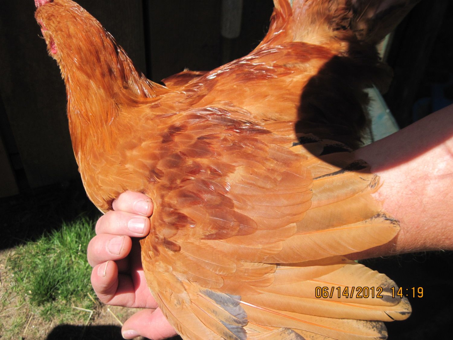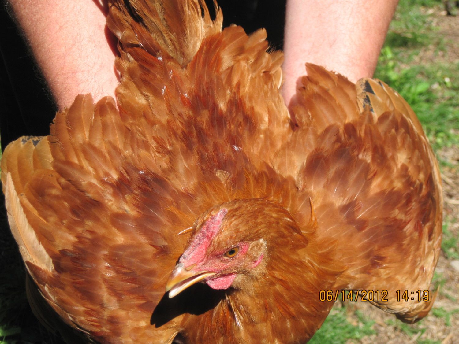 Flashy color, but they will probably be smaller and kind of "gamey" looking. The "Ginger" color and the "Confetti" color (seen on that small mostly white rooster) are two chicken colors that seem to be totally unique to the Aloha bloodline. (As in, I haven't had any luck getting that color by crossing other "existing" breeds? Like Sussex to New Hampshire Red, as an example.)