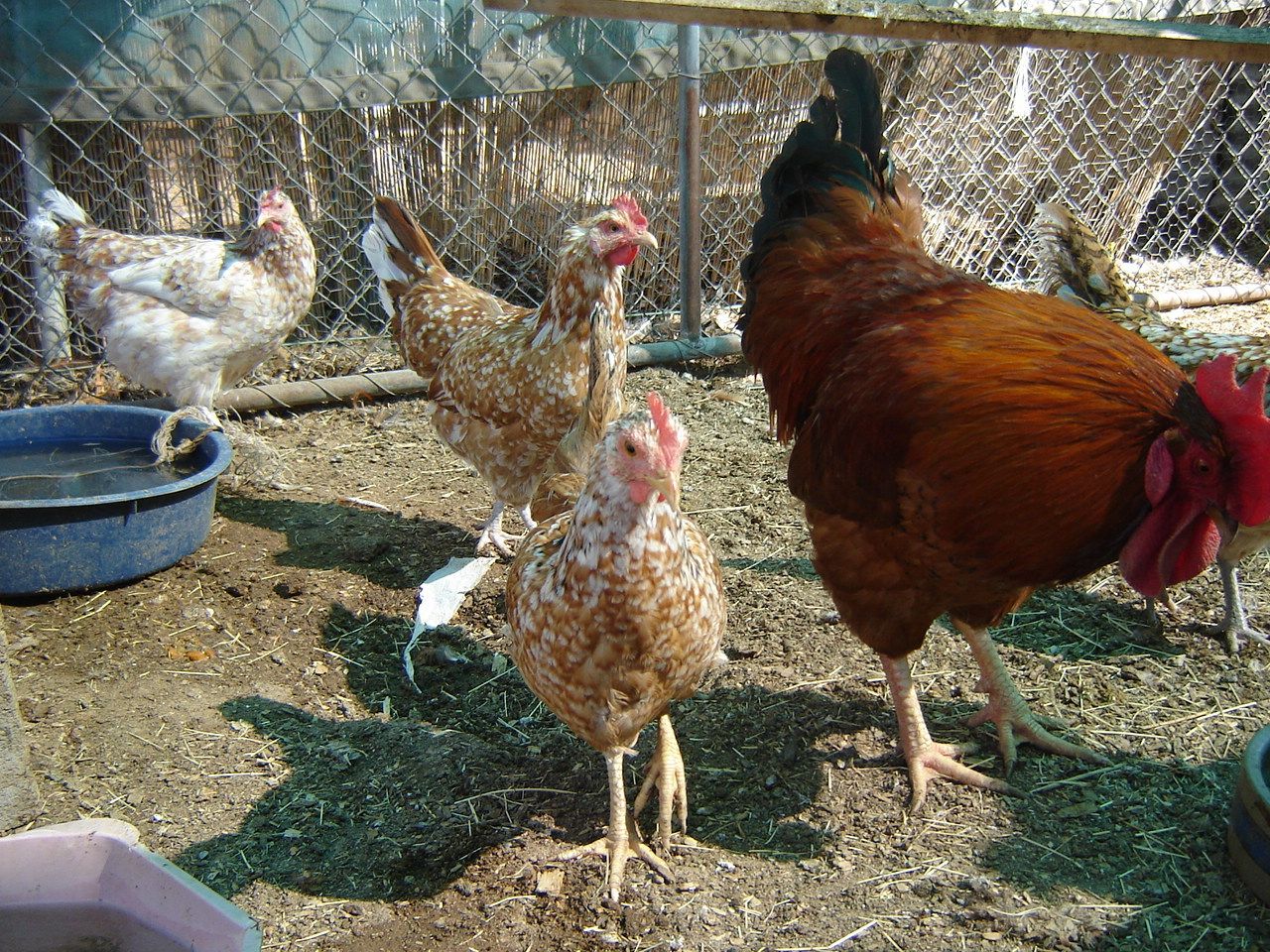 These big-bodied roos are being put in with my small but most colorful hens. Both of these roos carry the gene for spots and you can see a stray spotted feather tip here and there. It is hoped that when they are put in with these super-colorful hens, that hopefully some of the babies will be fully spotted from head to toe. The dads would help improve body shape and size, and the boys both have yellow legs, whereas all but one of the hens have either pink or mixed gray legs.