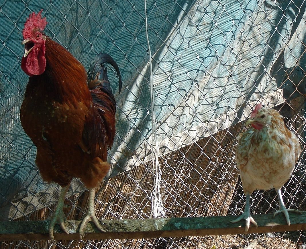 Oh, and speaking of NHR's . . . I set the eggs from the pen of Cheeto's baby roos over colorful small Aloha hens. These two boys are about 20% Buff Rock and about 10% NHR but you can really see the influence of the NHR in their color and body: