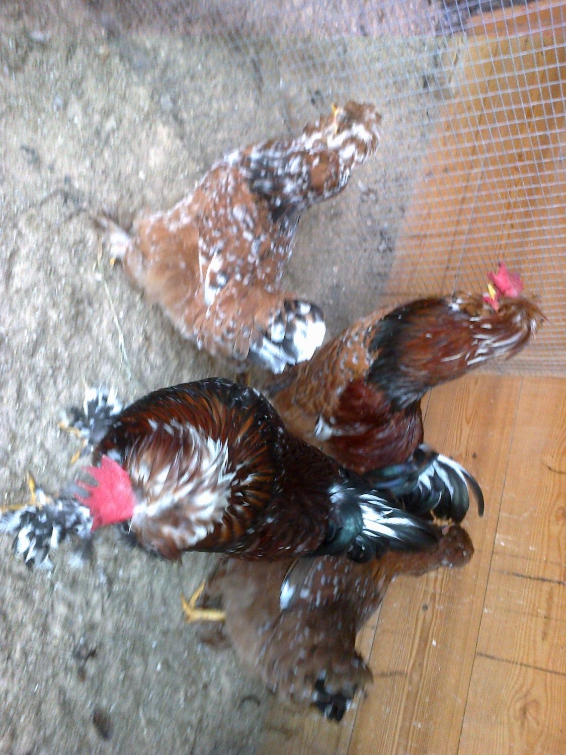 So these chicks would still be kind of small, because their dads are actually about 2/3rds Aloha and only about 1/3 "big chicken" which means the babies from this mix will be only about 1/6th "big chicken" and the rest little Aloha blood. But they should have better body type, with wider chests, and possibly yellow legs. If they end up improved and super colorful, that's still a step in the right direction!