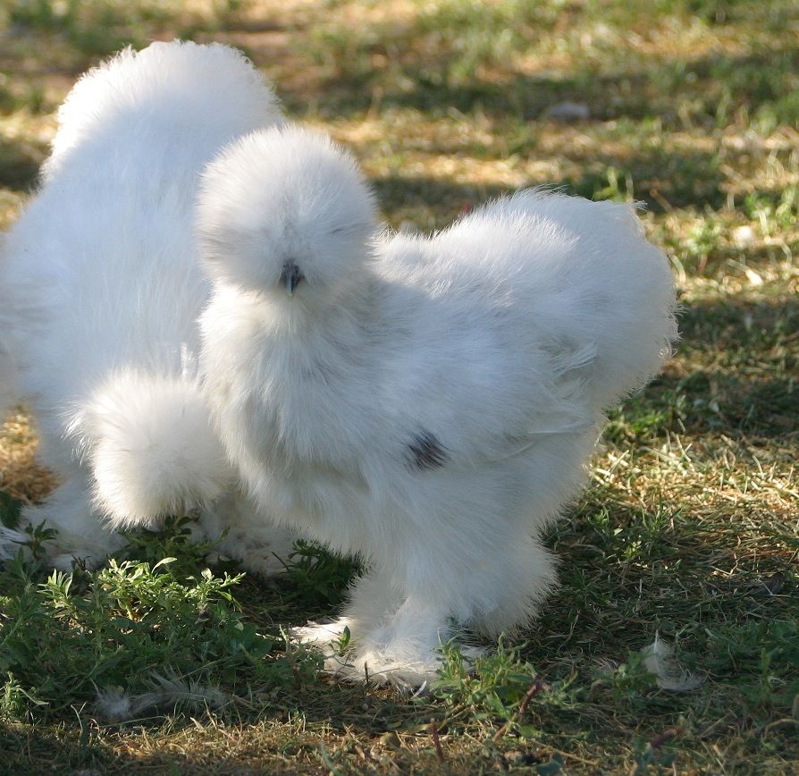 "Here is the story of how the American Paints started. I have been a back yard Silkie owner (not breeder, not necessarily an enthusiast) just a person who enjoys the fuzzy little beasts. Never went to a show, or knew anyone else that had any. Never had an incubator, just whatever hatched was welcomed. I had two black hens, but never could find a black rooster, so after a while, I allowed my white rooster to breed the black hens so they wouldn't be completed wasted. One of the chicks was a grayish bluish splash color I still have him. One winter it was SO cold I decided to put everyone together and heat one big room for them, a total of about 10 chickens. I thought that I would separate them in spring when they started laying again. I was a little late on one hen, and she was already sitting on a clutch so I just left her alone and let her hatch them. I went out and checked under the white hen that had been bred to that bluish little rooster and along with the other mish mash of babies was a white chick with distinct black spots. I picked it up and said to myself "hmmmm". I had never had one like THAT before. So I continued allowing those two to breed, but never got any more. Then when that one spotted chick grew to be a hen, I allowed the same grayish rooster to breed her, and still years went by with my hopes always to get another few spotted Silkies. Then after 4 years, all of a sudden in one clutch there were 4 out of 11 all beautifully spotted babies. I didn't know if this was common but I knew that I liked them and wondered if there were more out in silkie land somewhere. I ended up talking to Deb Steinberg, and told her what I had and wondered if there were more. I was curious about whether silkie breeders would accept them if I was able to make a bunch of them. She told me that projects like this had been tried many times, and the truth is that usually, the project fails because of lack of continuing on for various reasons. But she said if you REALLY get this going, let us know. She said there were birds similar to this in the Netherlands developed by a geneticist, and they were called paint silkies. I was encouraged to some degree so I thought I would give it a shot. Now I had one grown bird and 4 chicks. When they all grew up, I wound up with two roosters and two hens and the original spotted hen. I bred those together and then had fourteen. When I had fourteen spotted birds about a year later I tried to contact Deb again, but my computer had died and took her contact information with it. I searched around and found a past ASBC official and decided to ask them about it. This person told me that I had no idea what I was doing (and they were right)... that there was no such thing as a "Paint Silkie", and I made the whole thing up. They were very discouraging. They told me what it takes to get a color recognized and what a daunting task it is. So I let my enthusiasm die some, but kept breeding my birds, and then one day came across Debs info again and decided to call her, as she had seemed much more interested. I told her I now had fourteen spotted birds and sent pictures. SHE WAS SO EXCITED!!! Deb and Bren came out here to see my little program, talked chickens and took pictures of every feather, of eyeballs, pink toes, etc. They mailed pictures to Sigi the geneticist in The Netherlands. I never new there was so much to know about a chicken. When they left, I was overwhelmed, but so excited that this could be something really big. She told me my birds would be known as American Paint Silkies. Deb and Bren took home a few grown birds, mostly solid colored with the Paint gene, and a bunch of chicks, all with Paint genes. I was grateful for the information, grateful for the enthusiasm and for them taking their time to make such a big trip. I have been educating myself since then so I can do justice to this wonderful thing that started all by accident."