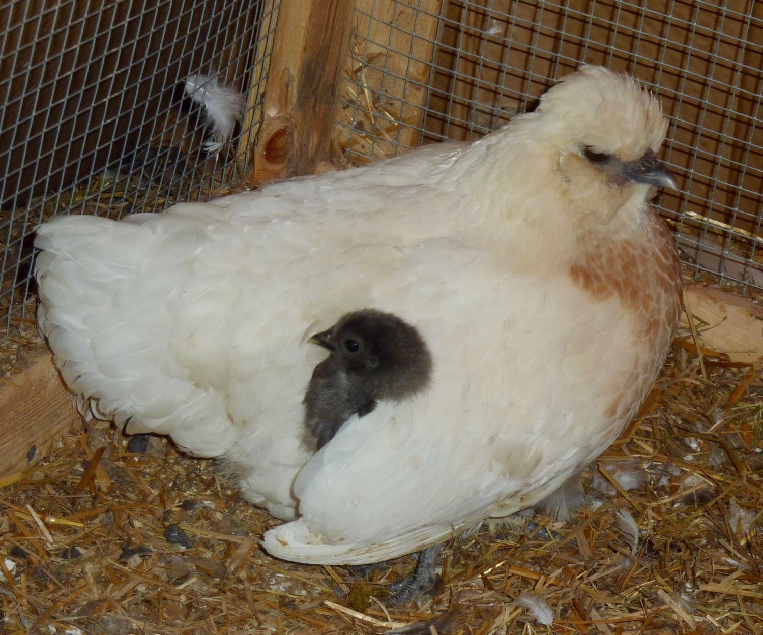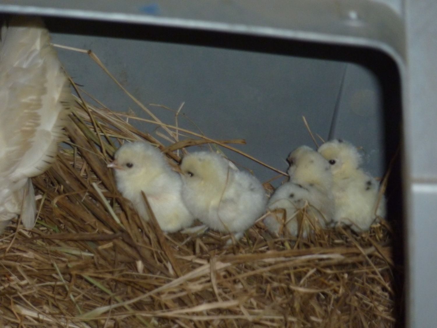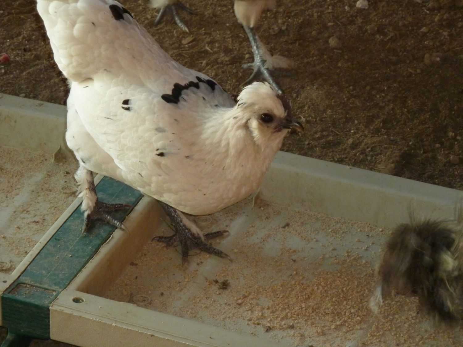I had a mix between a Red Pyle OEGB and Silver Sebright and these bred with a Showgirl Silkie rooster. There were four chicks hatched, all of which were spotted. The two males were white with red spots and the two females were white with black spots, just like paints. This makes me wonder, was it because the Naked Neck silkie had pink skin and may have been a cross-bred of some sort that dominant white would be found in this line?