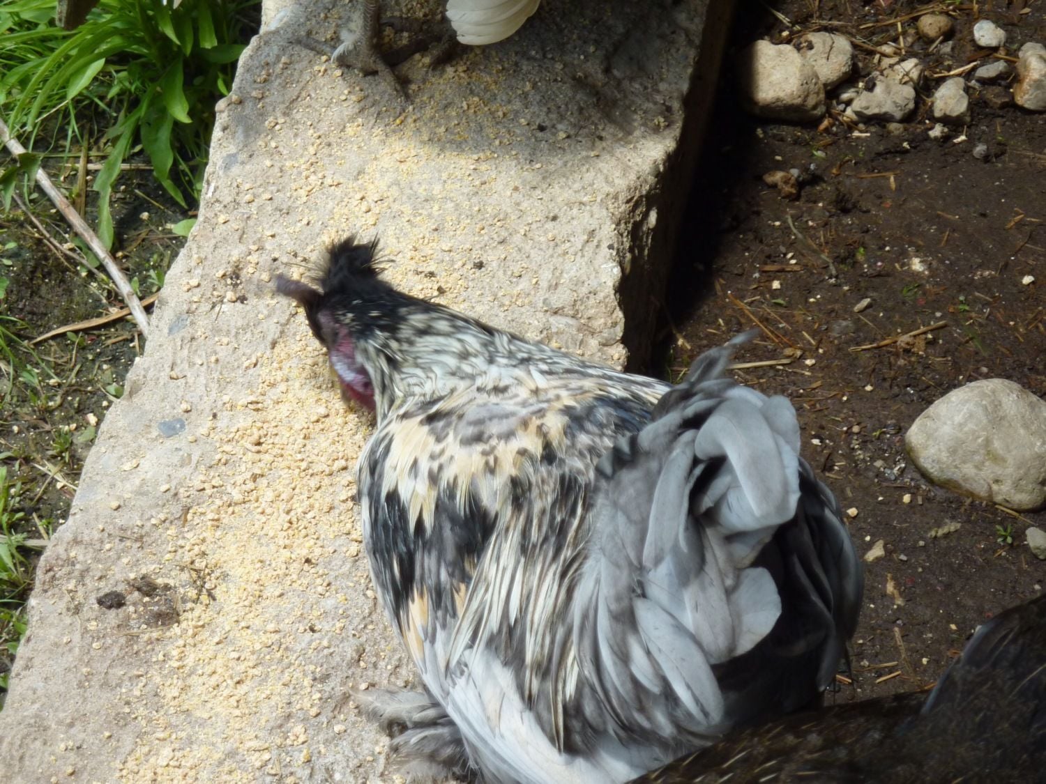 Dodie and dove have two other sister/half-sisters. Both have dark skin and feathered legs but Ruby (left) has a comb and dark eyes while Tad has light eyes and no crest. Tad, however, has silkie feathers. Why would that show through and not the Naked-neck? I thought Naked-neck was dominant?