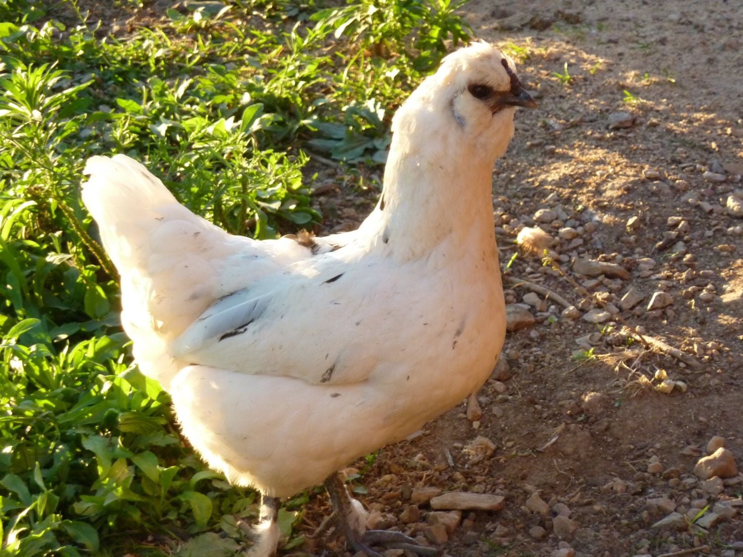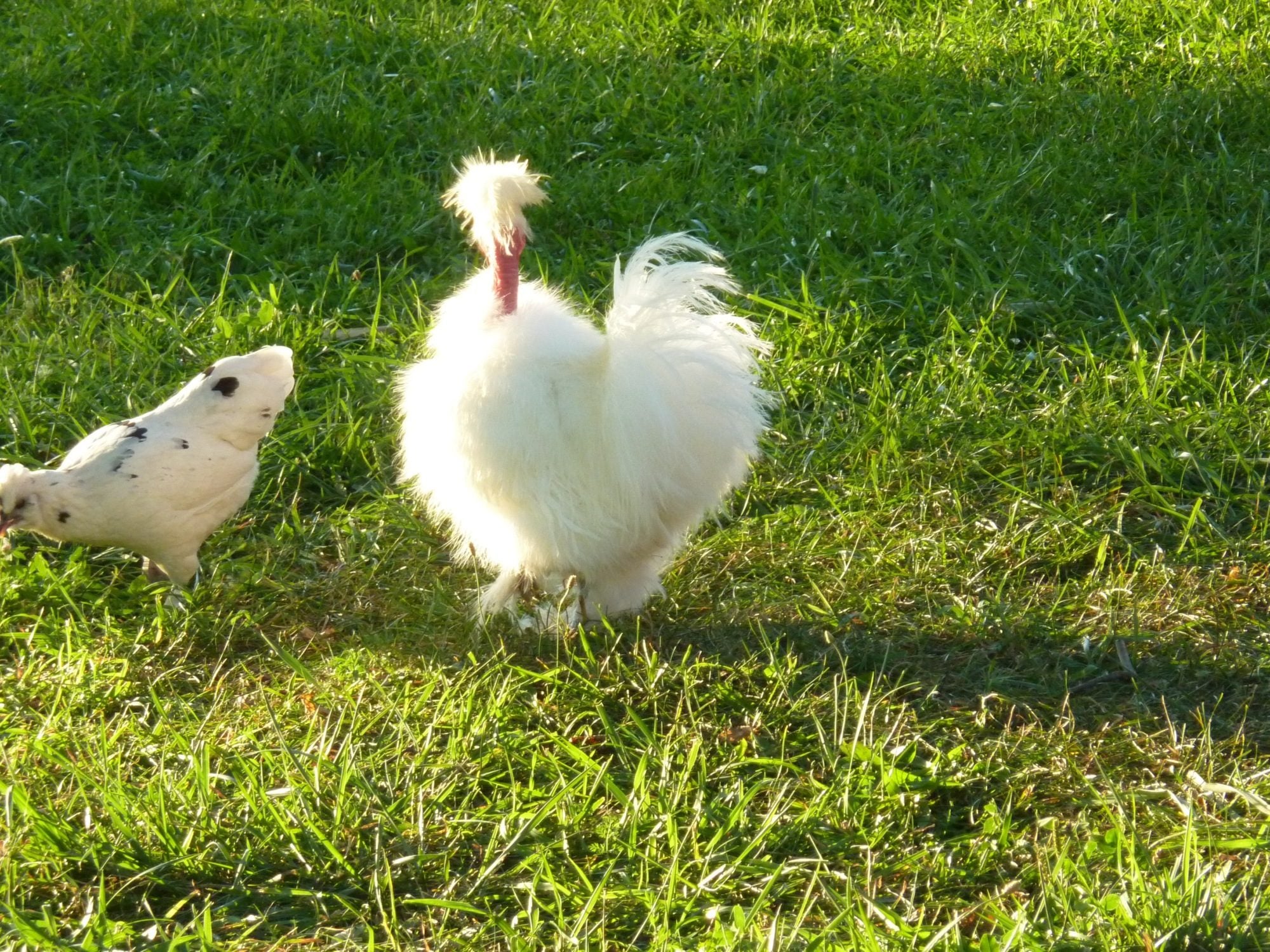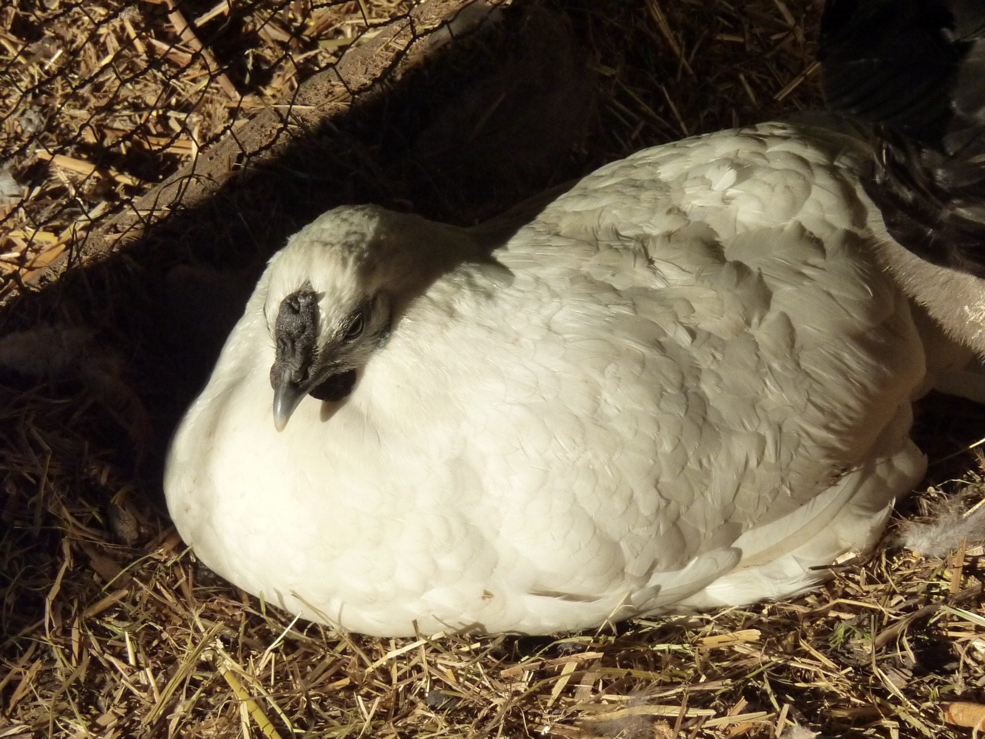 The hens turned out looking like this. This is Susie, whose spots did grow with age. One of her spots is a black feather on the wing covered by a white feather, which is why it is hard to see. She has dark eyes, which is how I tell her apart from her sister, who has golden ones.