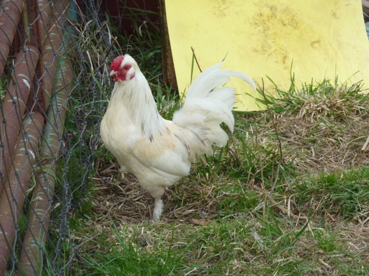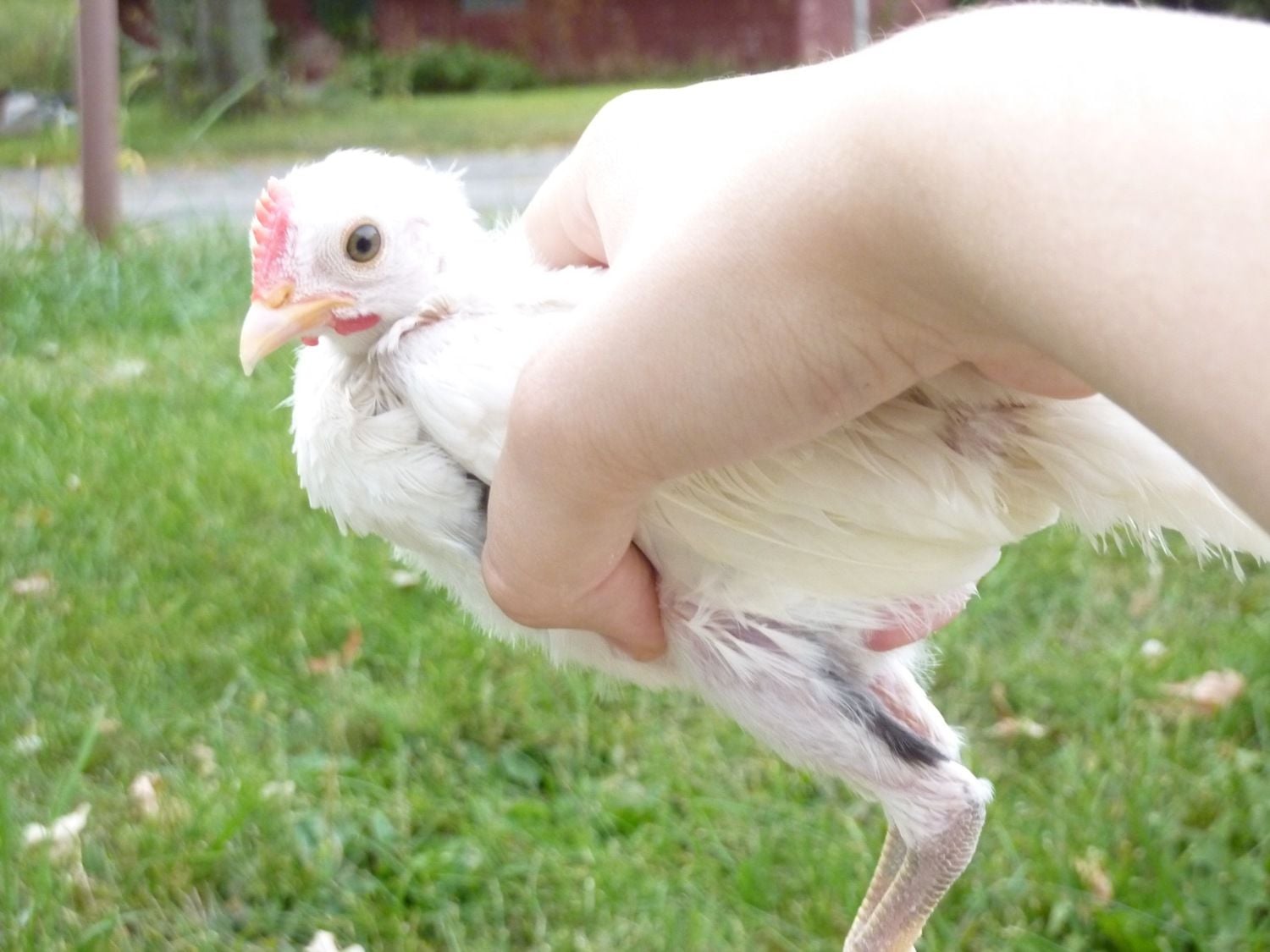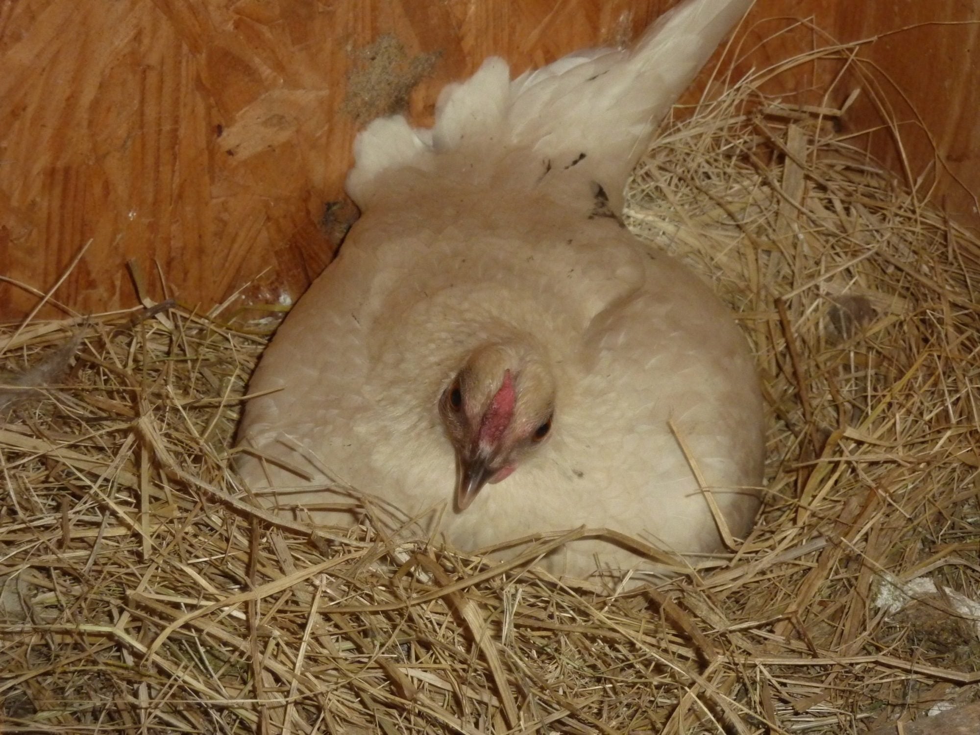 The hens turned out looking like this. This is Susie, whose spots did grow with age. One of her spots is a black feather on the wing covered by a white feather, which is why it is hard to see. She has dark eyes, which is how I tell her apart from her sister, who has golden ones.