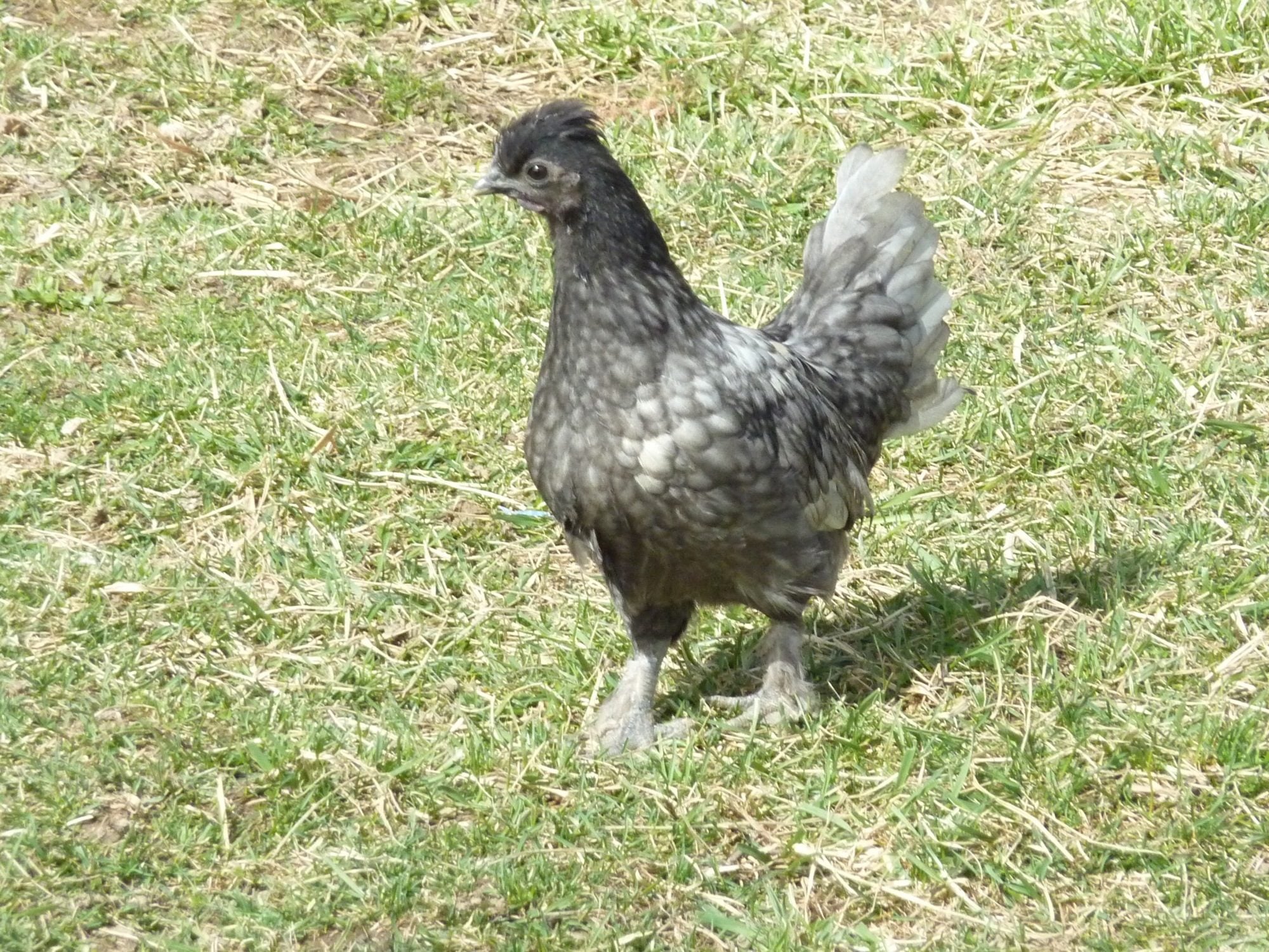 When Ruby got older she had two chicks with a Blue Silkie rooster. One (Rain) was black with silkied feathers, though he didn't have five toes or feathered legs, he did have dark skin and a comb. However, his brother, Noel had blue feathers, a single comb, and lemon patterning on his back.