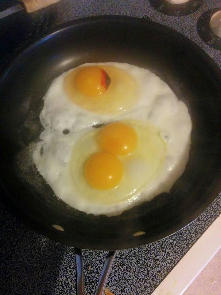 Two surprises today in my chicken adventure. An egg with two yolks in it and an egg with a blood spot in it. Poor bird probably burst a vessel pushing that huge two yolker out!!