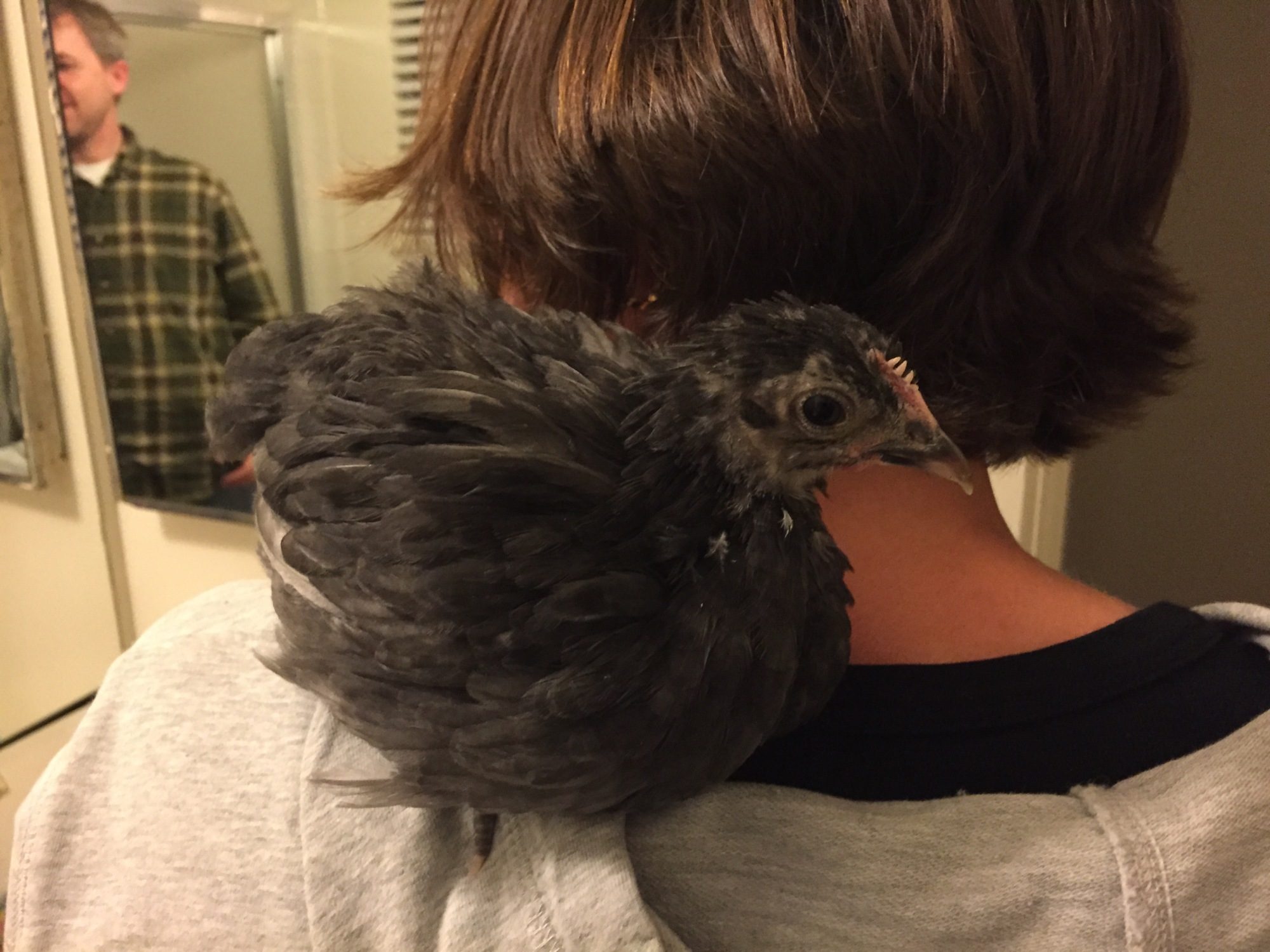 My little shoulder chick, 4 weeks old. She jumps up there every chance she gets.