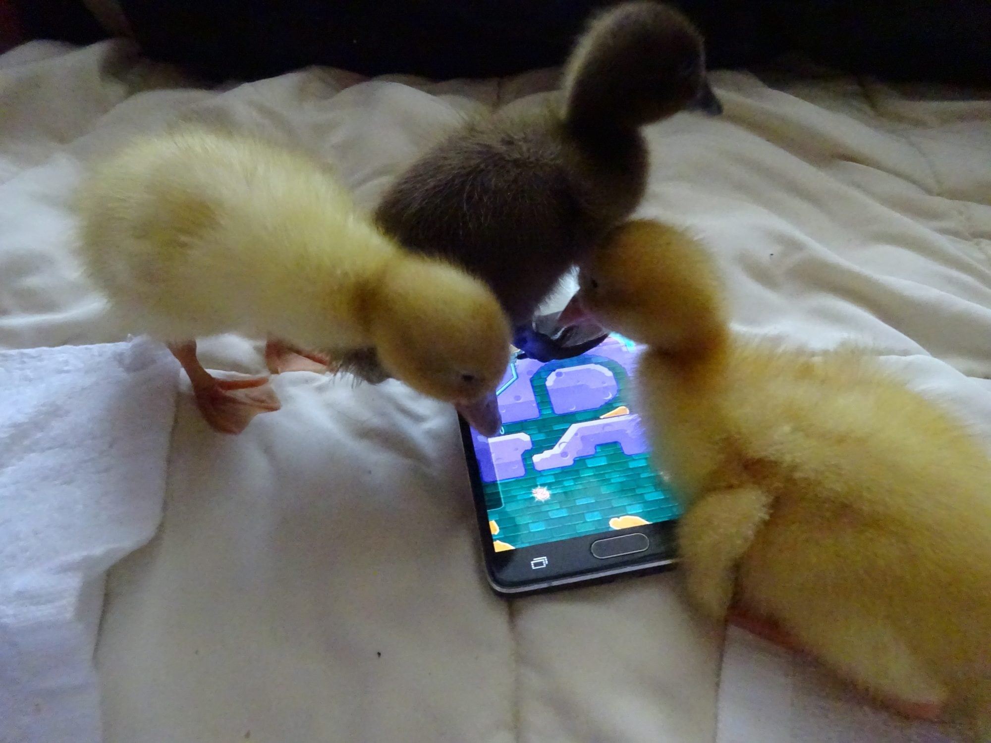 After their swim, the lings preened under the heat lamp for a few minutes. They ate a little bit and then peeped wanting to come out some more. We brought them out on the blanket and they ran around for a bit. I set my phone down and they immediately ran over clicked on firefox, the home screen with recent sites came up and they pecked on BYC. About 3 seconds after I set my phone down, they were on BYC! They had already texted a friend of mine about 4 texts the day before and because of swype, they sent him actual words...:rolleyes: So I took the phone so they wouldn't end up making entries and they gave me the duckie pout face (OK, they looked up at the phone like they wanted it...). So I brought up "Where's My Water" They really loved it. They only thing I must caution you about if you try this with your 'lings. Don't do it if your Google Play Store is set up to make in app purchases without a password. There were several times they tried to buy additional add-ons for the game. :gig Latte: Pecking the green stuff doesn't work... Allie: Casey, move your foot, I'm trying to dig the water into the loop... Allie: Latte - back off it's my turn... Quick, he's not looking, let's get BYC back up... Allie: Hey! All the water's gone... Hey look! If I peck the crocodile he jumps.