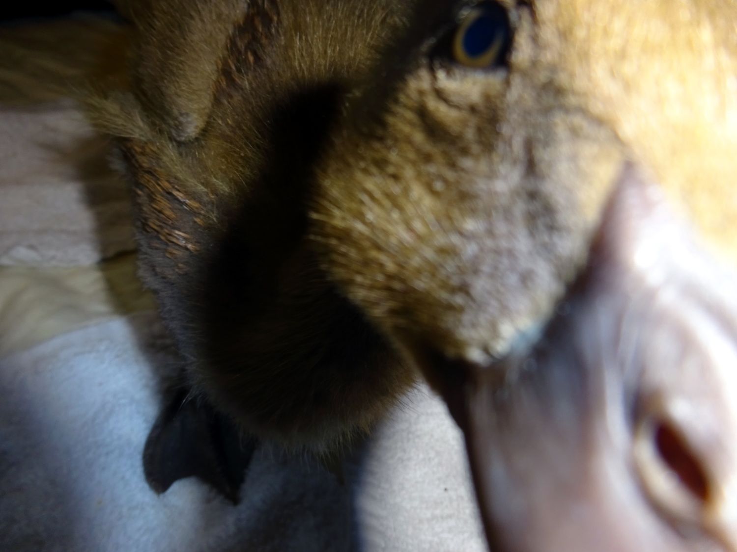 Kids and growing pains. lol they are so adorable and have gotten so big almost over night you can see the difference.After the 'lings had a chance to run around on the floor for a bit, they decided it was nap time. Sometimes they will cuddle up to us to sleep, sometimes not. Sometimes I will just lay my hand on one like this and just leave it there while they sleep. Allie and Casey are still fine with this and even seem to like it. Latte has already decided that being touched is awful and will have none of it. Although pulling buttons, collars, hair or skin on us is a great game...