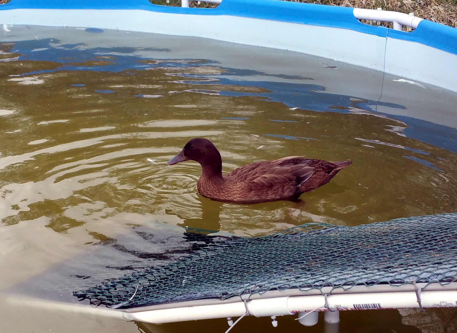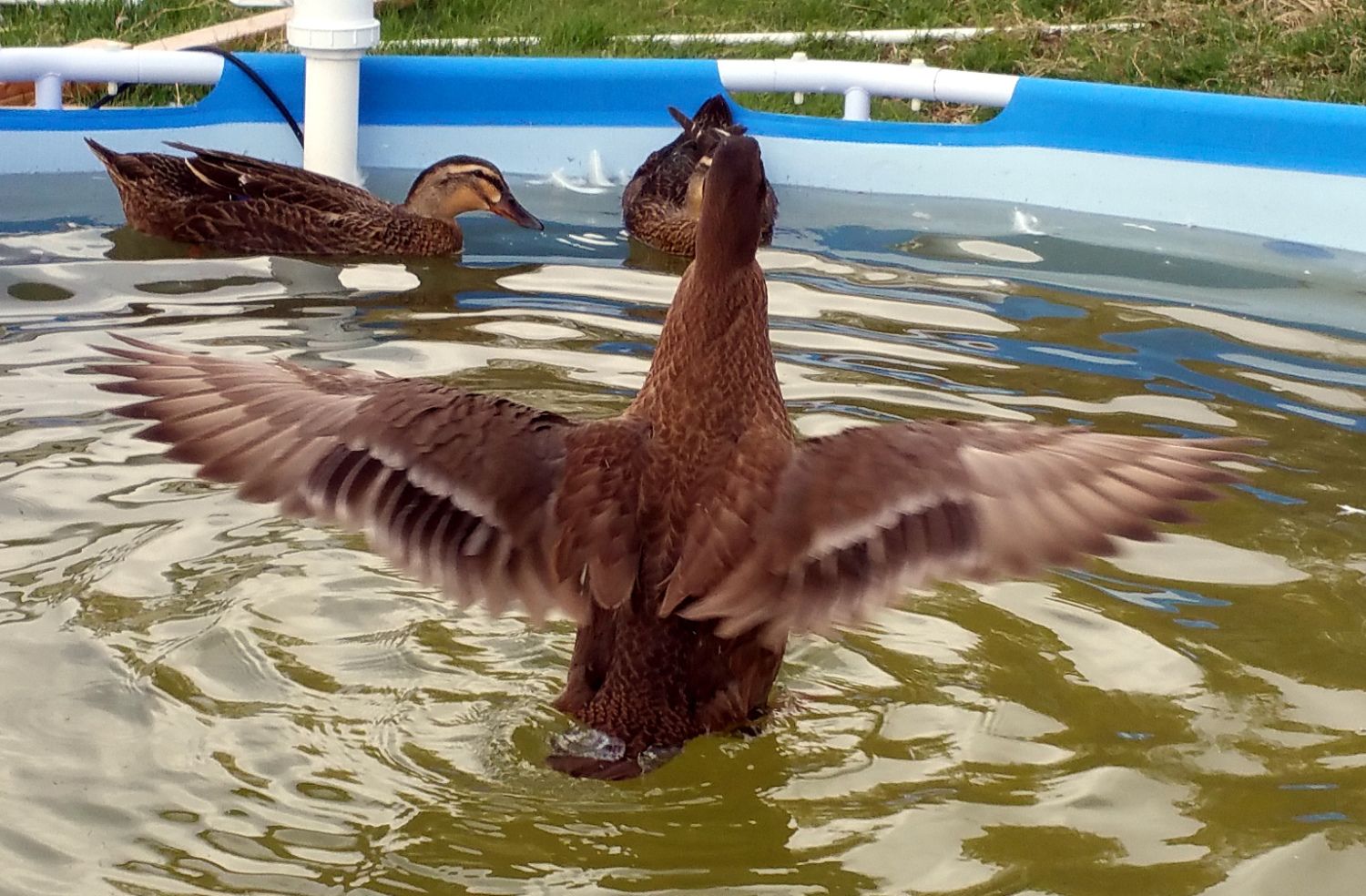 Here is some more enabling... Casey and Latte have completely mastered the pool ramp and can come and go as they please. Allie can't yet. Her legs are strong enough now to walk all day and to run at least 70' at a time. But climbing is a bit of a challenge still. She'll get it... In the meantime, there is still one kiddie pool in the yard so Allie can swim when she likes and when we are around and her sisters are in the big pool, we will put Allie in with them. She really enjoys it. Here Casey and Latte went and joined Tevye in the big pool. After Casey kicked Tevye's butt, he acknowledged that she was above him and they have gotten along famously. Tevye is the only duck I have regularly seen all three of the babies with. It was the same when Noir and Mystique were babies. Tevye does seem to have some pervy designs on Allie, but she is bigger than he is so he might not know she is just a 'ling. Anyway, he isn't too aggressive about it and she can just swim away saying, "no thank you." In contrast to Tevye's non-aggressive pursuing of Allie, I saw one of the funniest things of my life yesterday when we let Kaine out on parole (he is getting better and is often out for nearly an hour before he has to go back in jail). Kaine decided that he wanted a little action from Pocahontas. For some reason Pocahontas was having none of that (she is usually pretty willing). So out of nowhere zoooom shooting past me is Pocahontas and Kaine. Pocahontas is running for all she is worth swerving left and right as she ran, and Kaine is riding on her back holding on her neck with his bill, one foot in the middle of her back, and his other foot hopping along the ground on the side like he was riding a skate board or a razor on X games. This went on for at least 50' (then they disappeared behind the pool and I couldn't see them.) Ducks do the darndest things... Edit: Also in the news with Kaine yesterday... When we let him out, normally the first thing he does is make a bee-line for the big pool. Well yesterday he got halfway up the ramp and Casey came from inside the pool and walked up to the peak of the ramp. Kaine stopped in his tracks... He looked at Casey. Casey just stood there. He turned around and walked back down the ramp and never went into the pool the whole 1-1/2 hours he was out (Casey got out of the pool 5 minutes later so he had a free pool available most of the time.) The only action between Kaine and a duckling the whole time was he walked near Allie and looked at her, she quick stepped a few feet away from him and he let her be. So although friendships haven't really been made yet (with the possible exception of Tevye), the entire flock (all 15) are getting along. Even Latte has calmed down for the most part.
