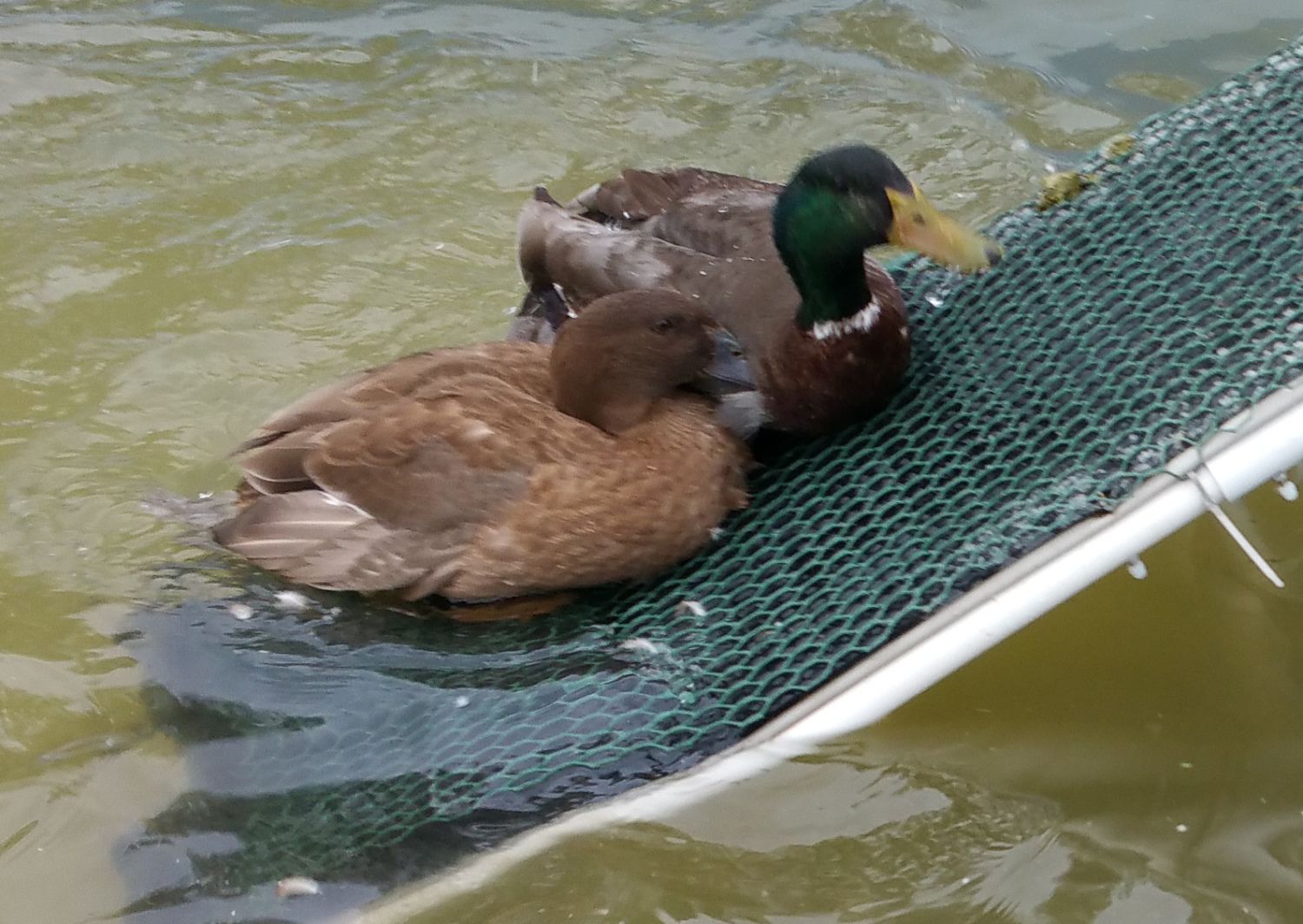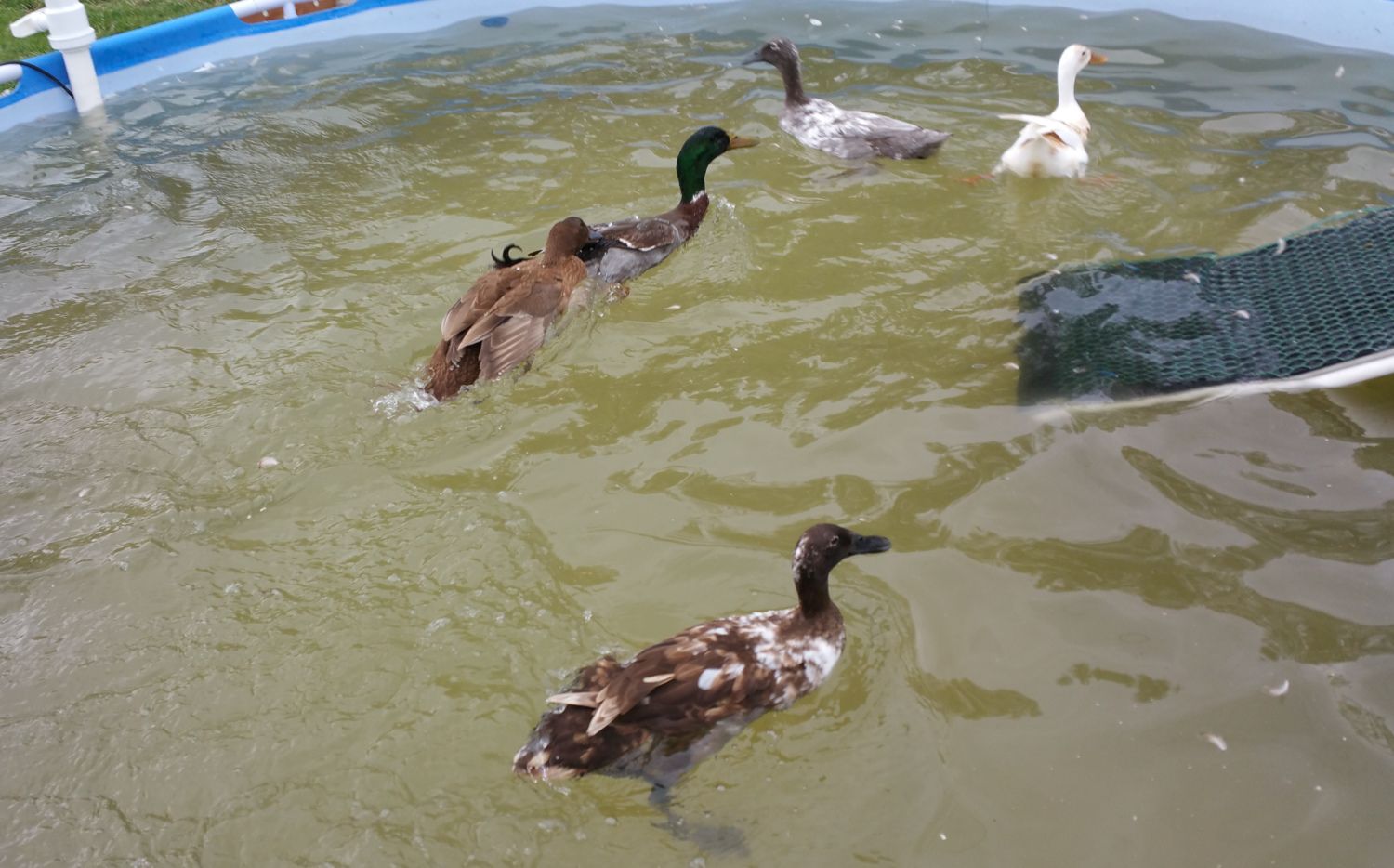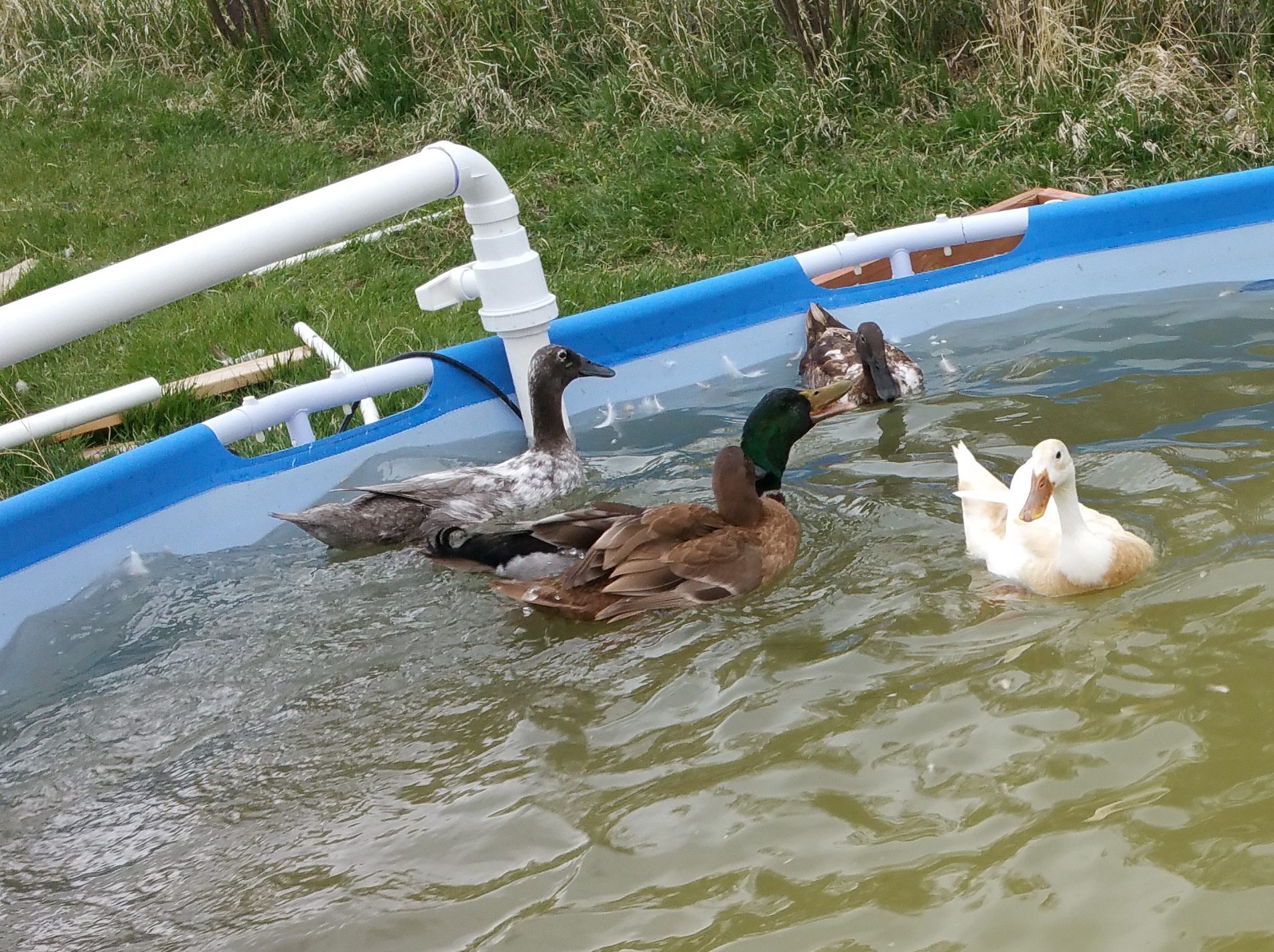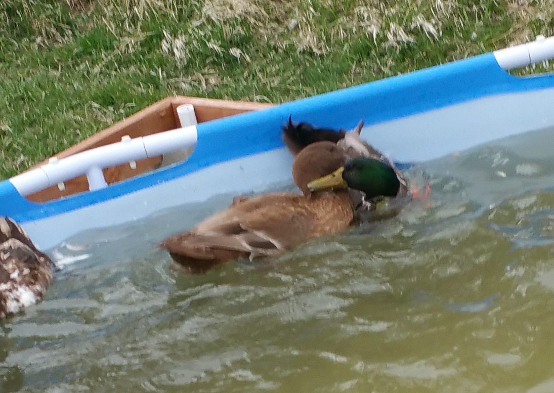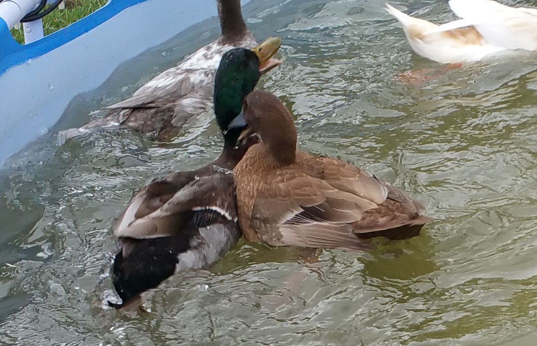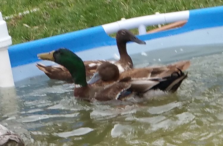 Here Casey and Latte went and joined Tevye in the big pool. After Casey kicked Tevye's butt, he acknowledged that she was above him and they have gotten along famously. Tevye is the only duck I have regularly seen all three of the babies with. It was the same when Noir and Mystique were babies. Tevye does seem to have some pervy designs on Allie, but she is bigger than he is so he might not know she is just a 'ling. Anyway, he isn't too aggressive about it and she can just swim away saying, "no thank you."