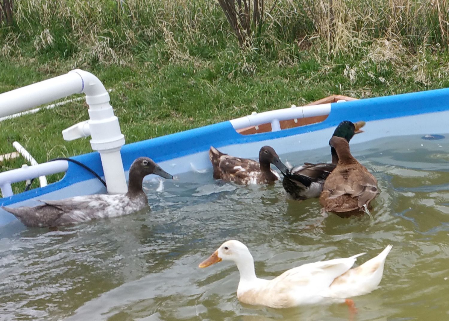 Edit: Also in the news with Kaine yesterday... When we let him out, normally the first thing he does is make a bee-line for the big pool. Well yesterday he got halfway up the ramp and Casey came from inside the pool and walked up to the peak of the ramp. Kaine stopped in his tracks... He looked at Casey. Casey just stood there. He turned around and walked back down the ramp and never went into the pool the whole 1-1/2 hours he was out (Casey got out of the pool 5 minutes later so he had a free pool available most of the time.) The only action between Kaine and a duckling the whole time was he walked near Allie and looked at her, she quick stepped a few feet away from him and he let her be. So although friendships haven't really been made yet (with the possible exception of Tevye), the entire flock (all 15) are getting along. Even Latte has calmed down for the most part.