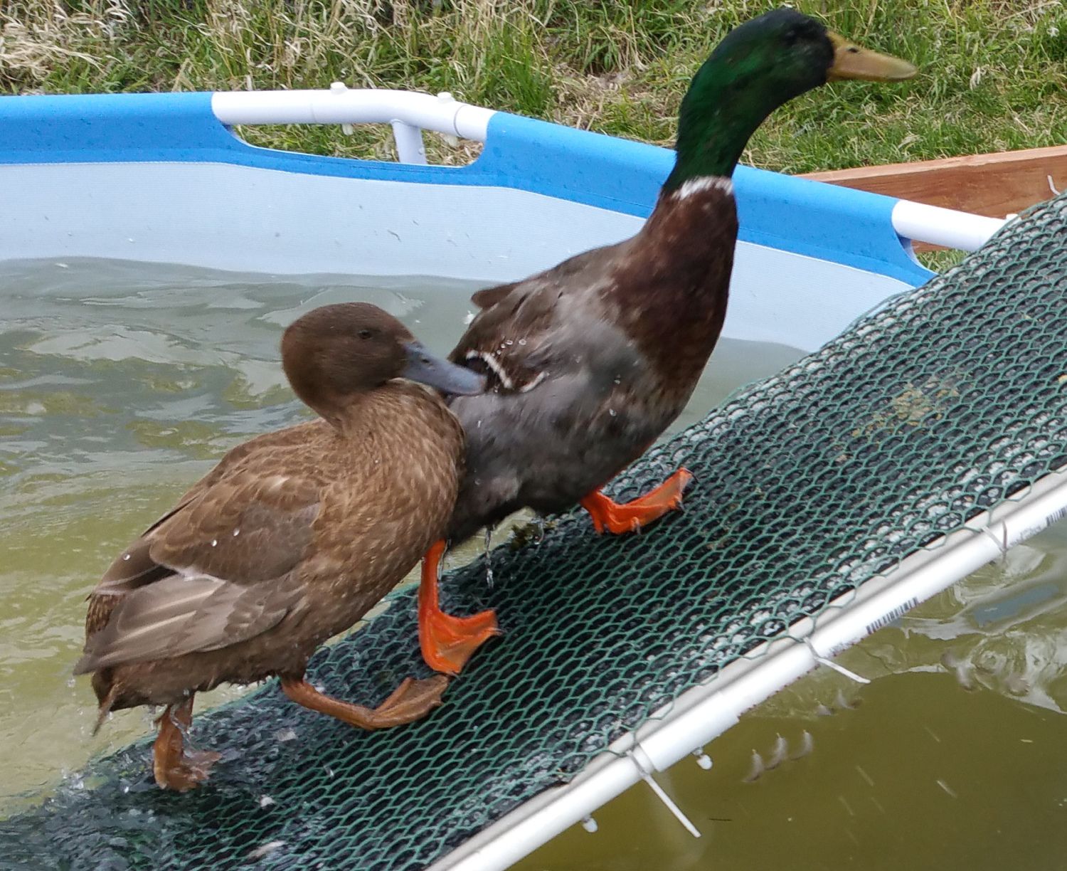 In contrast to Tevye's non-aggressive pursuing of Allie, I saw one of the funniest things of my life yesterday when we let Kaine out on parole (he is getting better and is often out for nearly an hour before he has to go back in jail). Kaine decided that he wanted a little action from Pocahontas. For some reason Pocahontas was having none of that (she is usually pretty willing). So out of nowhere zoooom shooting past me is Pocahontas and Kaine. Pocahontas is running for all she is worth swerving left and right as she ran, and Kaine is riding on her back holding on her neck with his bill, one foot in the middle of her back, and his other foot hopping along the ground on the side like he was riding a skate board or a razor on X games.This went on for at least 50' (then they disappeared behind the pool and I couldn't see them.) Ducks do the darndest things...![]()