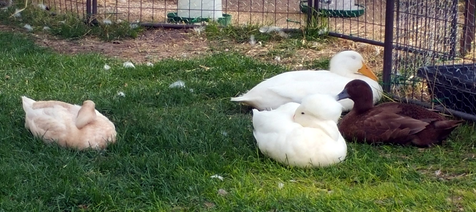 We started our foot inspection and weigh-in program today. No severely bad feet, but the iodine does get used. I am including this here because now that the ducklings are in with the flock, I wanted to show where they rank as far as weight with the established members... from lightest to heaviest: