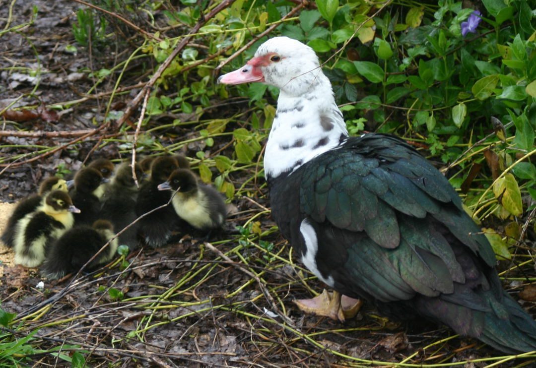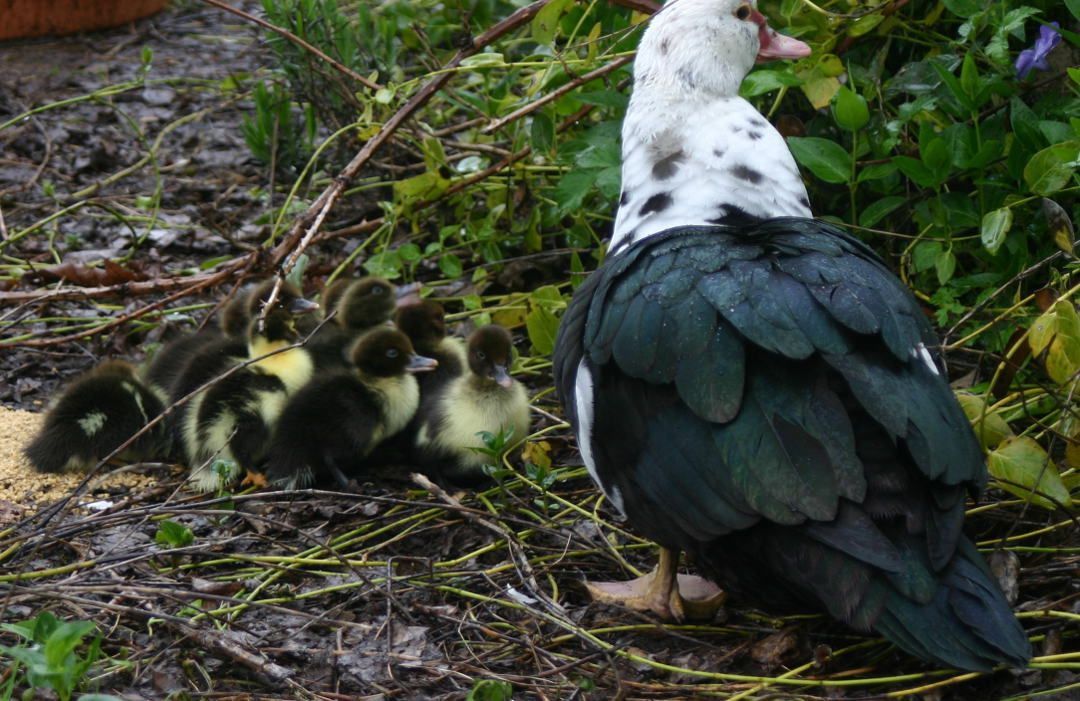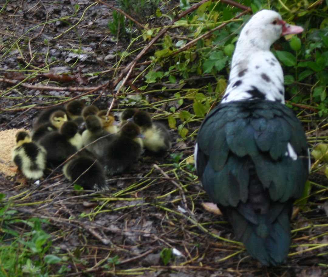 Mama showed up with 11 babies on Sat morning. Three went to new home already (pre-sold weeks ago) and 3 we are keeping. The rest are going to the poultry swap on Saturday to find new homes of their own. I got 5 more muscovies (and a rouen mama, and 6 more geese) on nests so it's senseless to keep the first batch. But they're so cute and fun!