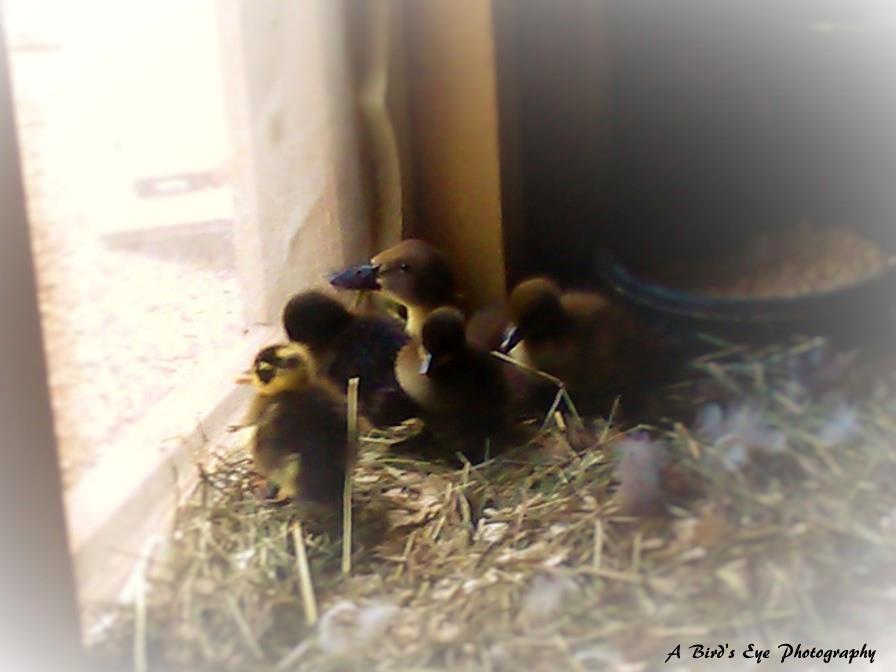 oh my gosh so sweethello Miss Lydia, I have an update not only was Boomer two weeks old yesterday but we had 4 babies all hatch out. They are so cute. The mother duck is doing the same as the other mother did, she gets off to go outside and bathe. She just popped off the the babies and went out that's how I knew they had hatched. In the morning there were 4 eggs by dinner time there were three babies and the fourth had pipped as I was so surprised when she got off the nest that it was full of babies. While she was out bathing and eating with the others Boomer's mom came in and sat on the nest until the other mom came in. I am so amazed at these two mother ducks. Little Boomer goes over and lays on the nest with the both mothers and I saw Boomer putting some hay in it as if caring for the babies (I am hoping Boomer is a girl). We have the Drake completely locked out now as my nerves can't handle it. He watches from next door. Both mother's still go out and bathe and Boomer will still go over to the window and wait for his mom. We are going to divide the outside pen to keep the drake on one side and the rest on the other. Here is a pic of my new little ducklings One of them which I have named PI is so colorful and beautiful. Thank you for your help![]()