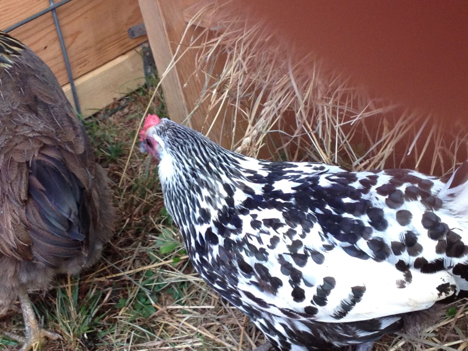 This young lady arrived with a completely mangled leg. Apparently a dog crushed her. A spitzhauben x, she is friendly, smart and she lays lovely teeny weeny white eggs.