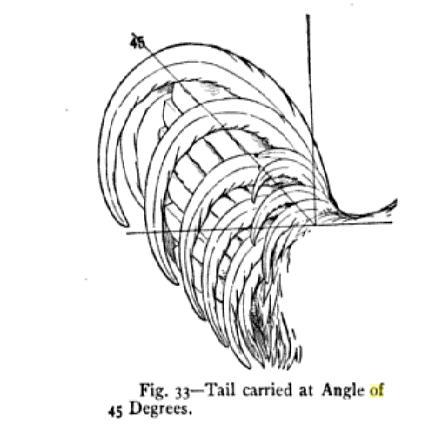 Back to purebred buckeyes, here is an image of a 45 degree male tail. Before anyone jumps me, the standard calls for a 40 degree tail. I couldn't find one that shows that angle with a tail similar to the male buckeye. So if you have something similar but not quite this angle, you are correct in the angle. And to also be clear, the female tail should be 30 degrees. This image is only representing the male tail. Also try to keep the tail as wide as possible to avoid the pinched look that many today exhibit. The best way to describe it is rounded across the top like an upside down U and not shaped like an upside down V when looking from the rear.