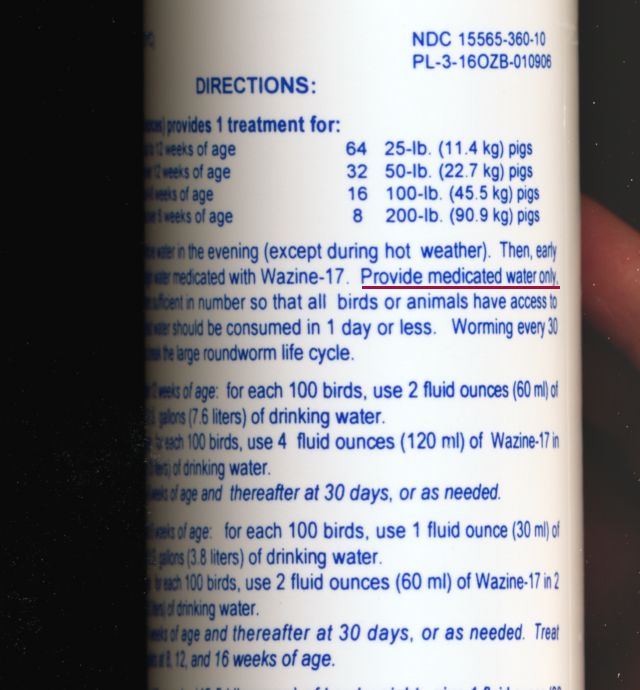 The directions read like this: "For best results, remove water in the evening (except during hot weather.) Then, early the next morning, begin water medicated with Wazine-17. Provide medicated water only, distributed in waterers sufficient in number so that all birds or animals have access to water. The medicated water should be consumed in 1 day or less."