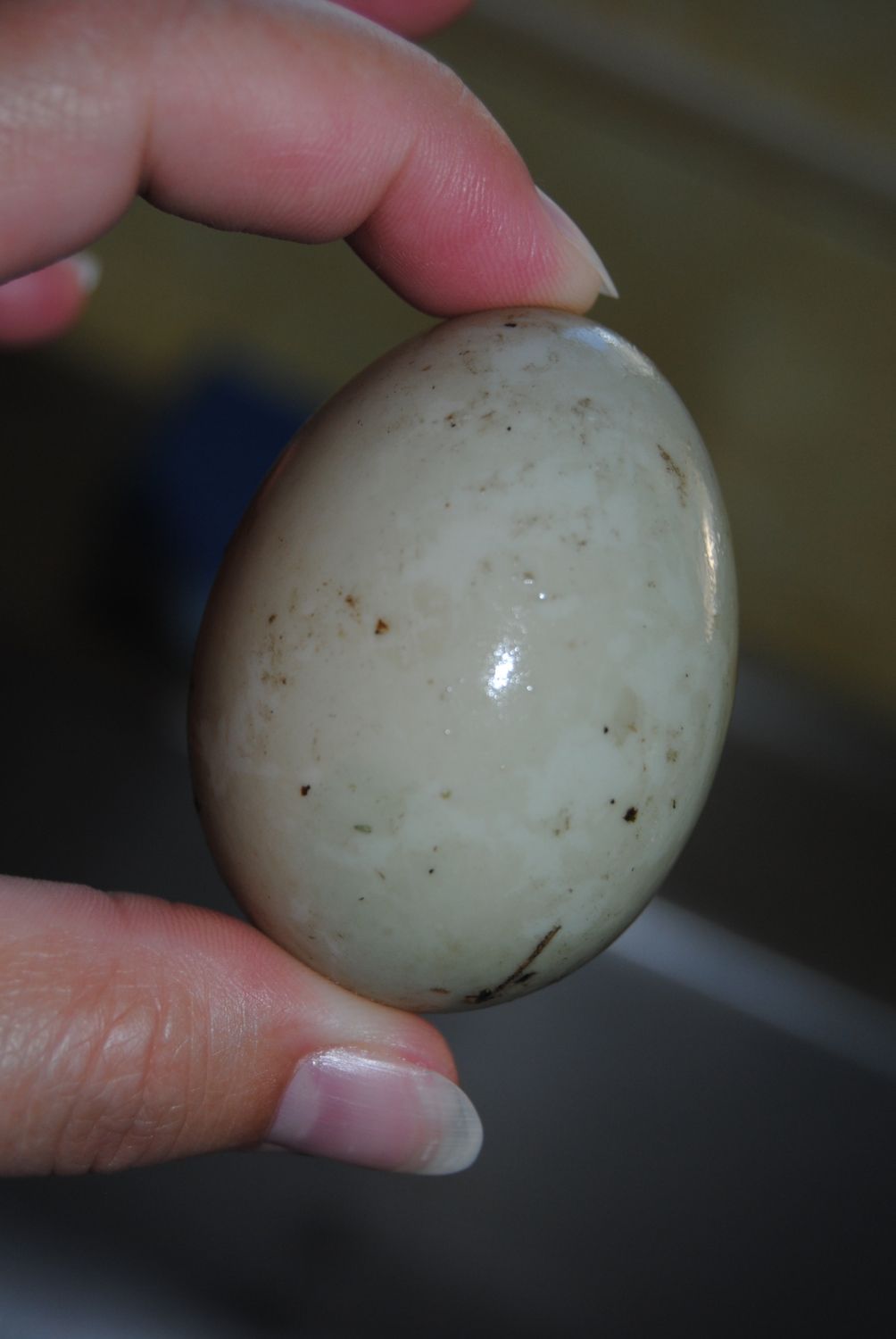 So I posted about a week ago (forgive me, I don't know how to change post title to reflect an edit or update). But I posted that my son and I found a little nest on August 19th but there was only one egg in the nest at that point. My son (3 years old) couldn't leave the egg alone so we took it from the nest. Went back a couple of days later there were no more eggs. So without my son I looked a little harder for eggs, nest found! About every other day I would go check the nest and count the eggs. At my last count which was I believe Friday August 30th the count was 11 eggs (we found 3 in the yard and added them). Hadn't been out to check on the nest since Friday due to crazy work schedule, but I went out today to check it and count eggs and my little broody mallard mommy is sitting finally!!! So I'm not totally sure how many eggs her clutch ended up being but I'm pretty excited to let the countdown begin to "D" day!!! For mallards it's roughly 28-30 days from what I've read. I've been finding other eggs randomly in my yard though is that weird? We have a total of 13 ducks, 11 mallards (7 hens and 4 drakes) and a male and female pekin. So not sure whose been dropping them off in the yard but I picked two up today. Here are some pictures of what I picked up, they look fertilized to me but I'll ask an expert opinion