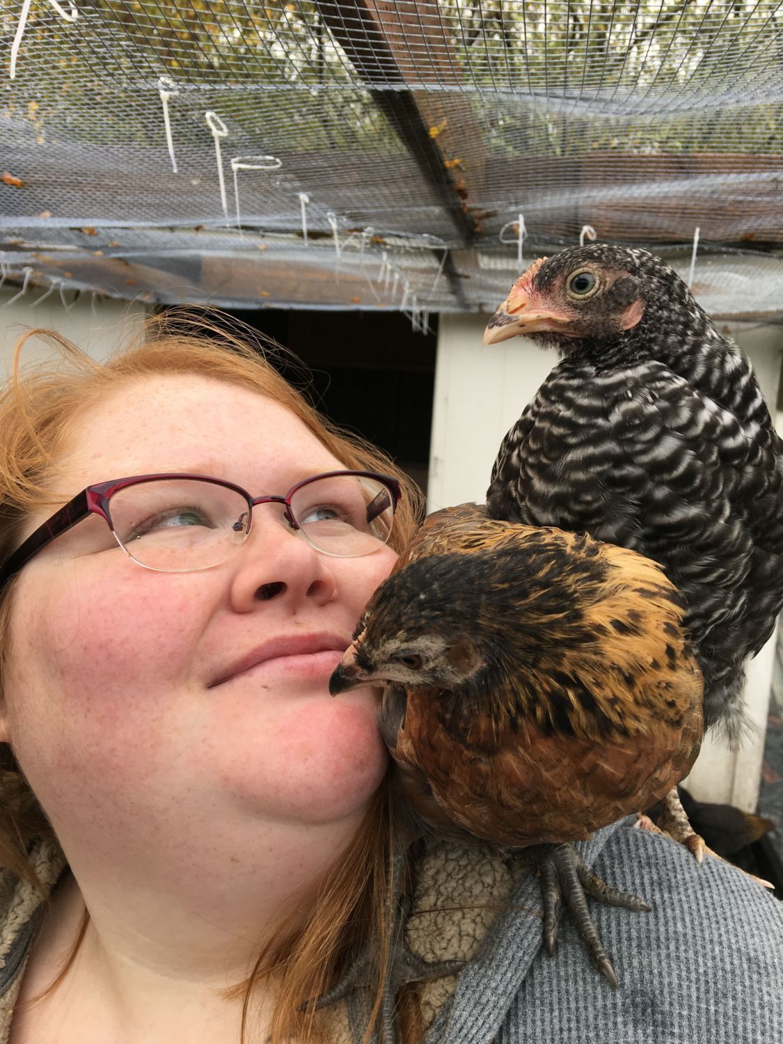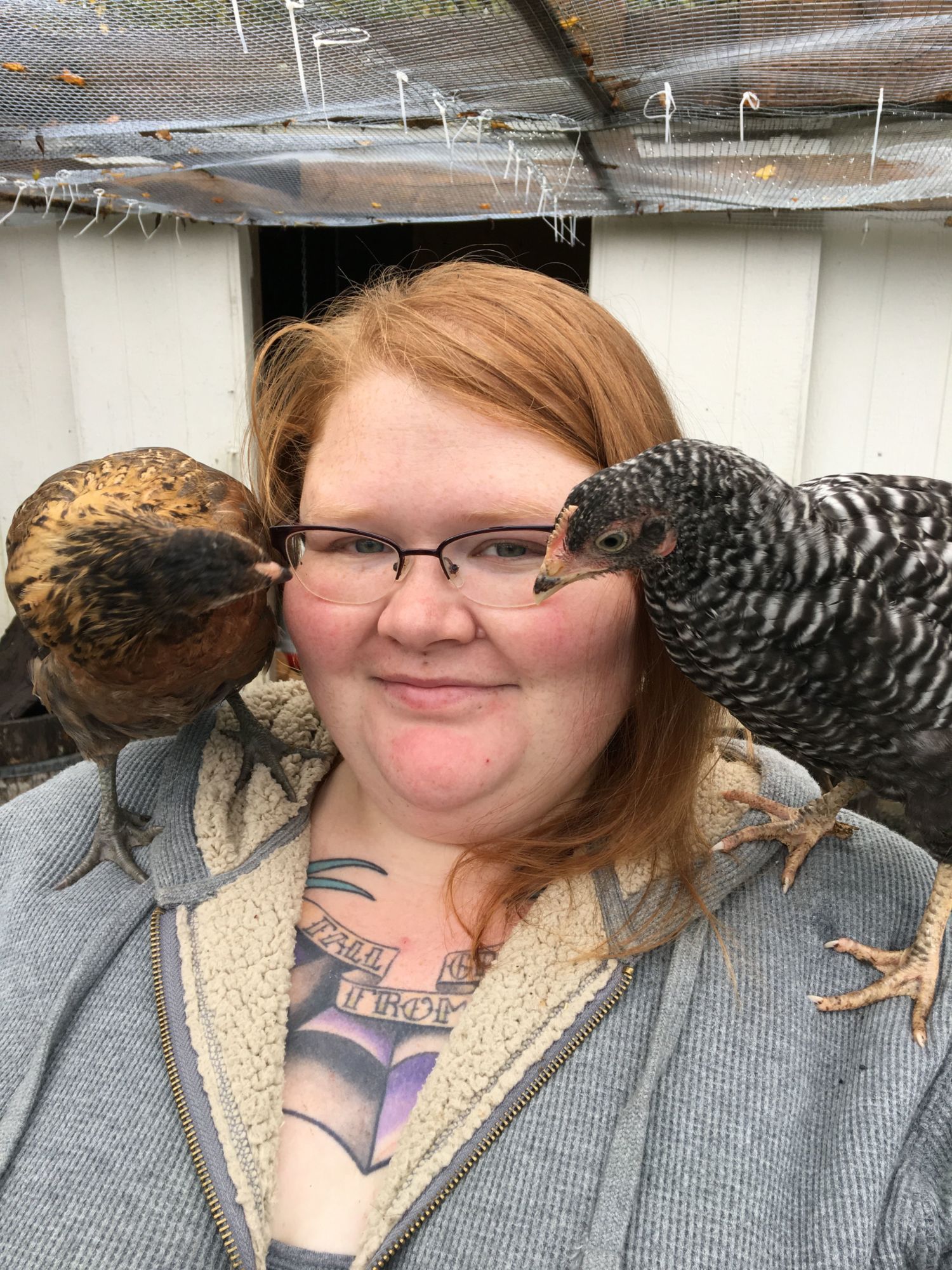 I actually didn't they just do it on their own we have lots of chickens who jump up on us the key is handling them regularly since day 1How did you train your chickens to sit on your shoulders?