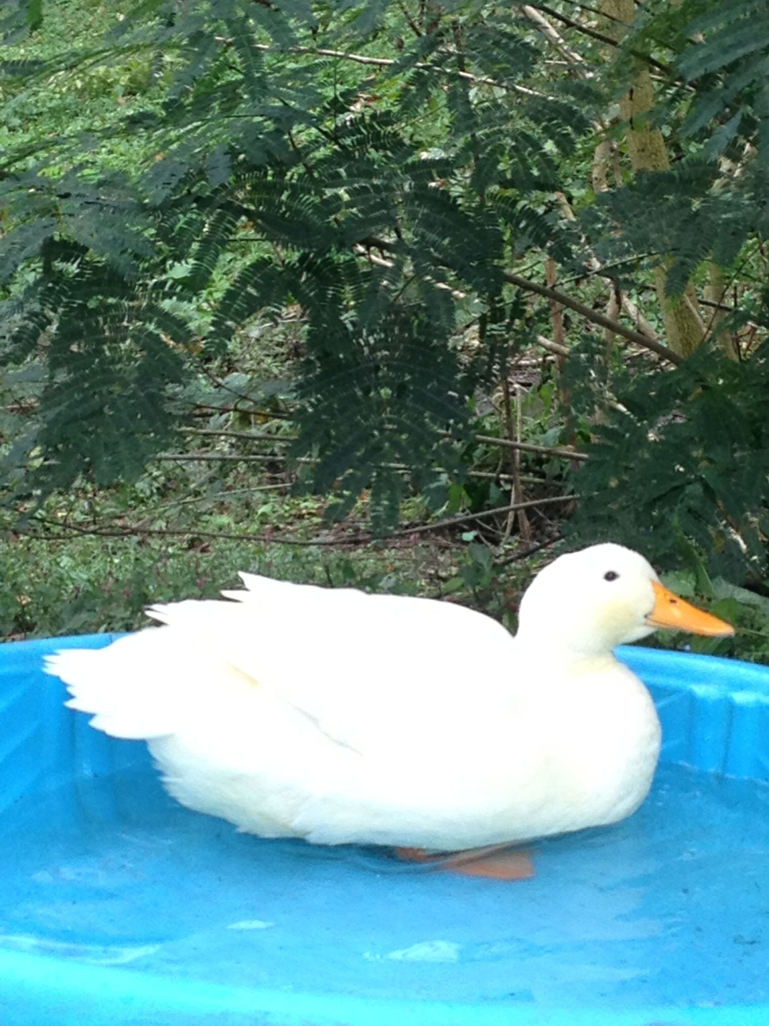 That is a really lovely Pekin! They have a butter yellow tint to their feathers, and look pure white from a distance. When she starts laying eggs, her bill may change color. It will get a softer orange, and may get colored spots from the hormones. How old is she?