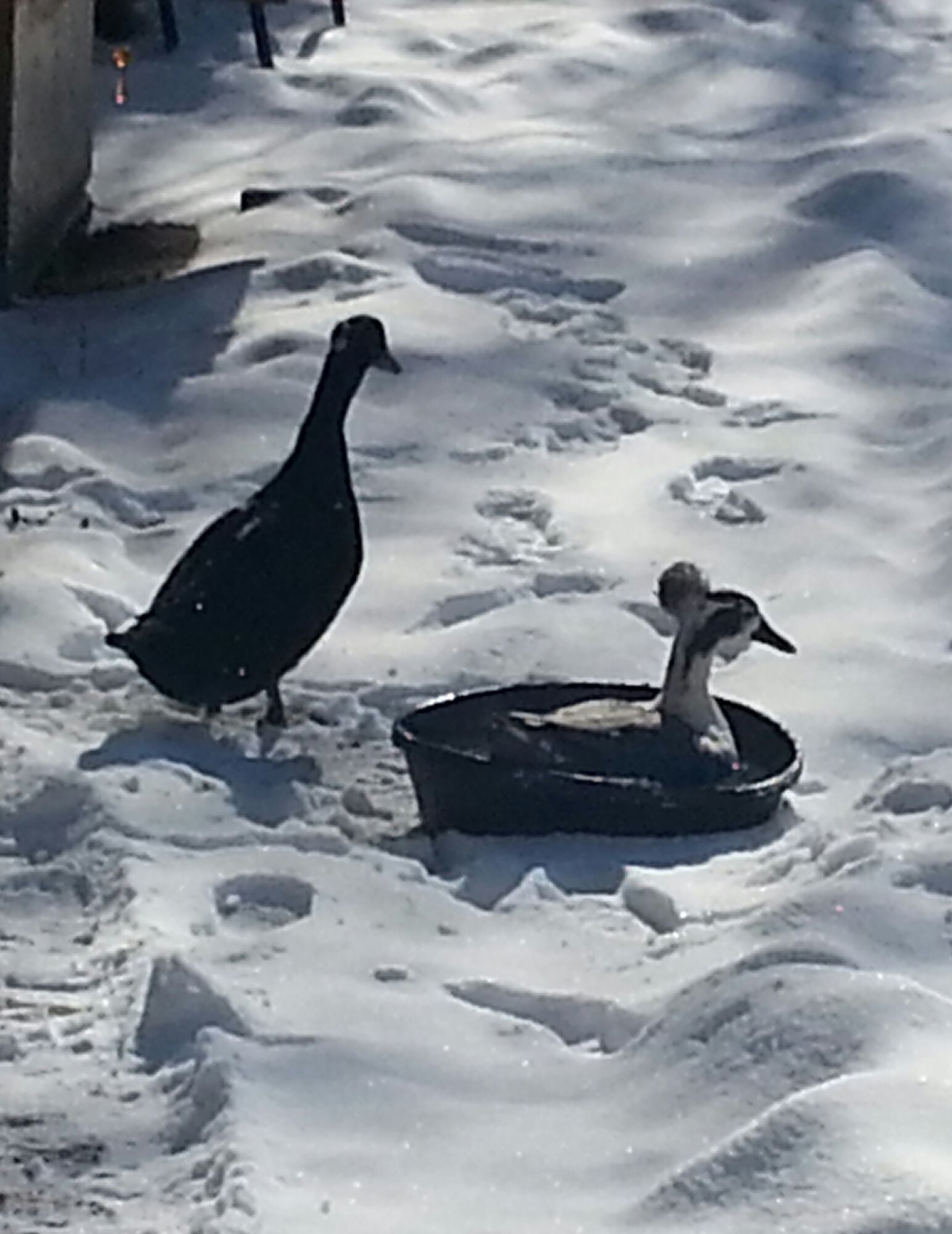 Question! It's been extreamly cold here, Snow covered ground, single digits and wind chills around -13. Ducks don't want anything to do with it! They step outside and fly back into the garage within minutes. I blocked off part of our garage for them straw and shavings down, a heat lamp in one spot and their crate accessible all day. I offer them to go out but they just run and fly back in. We have 2 small in weight khaki Campbell's and 2 small in weight welsh harlequins all 4 have been laying daily since 4 months old. They are now 9 months old. 1 runner that's 4 months old not laying. Well for 3 days now 1 duck is not laying which is very odd. I can't figure out who! Did another head to vent check over and all looks good. Any suggestions as to what's going on? Do I have a sick duck? How can I identify who it is? I've also been trying to get another pound on each of them so for 6 ducks I give about a half cup ground mixed grains and a half cup cracked wheat a day. In the evenings I give 2 cups thawed fresh corn and alternate nights with 2 cups thawed fresh peas. Should I supplement them more? They get flock raiser and layer feed all day long. Water and vitamin water too.