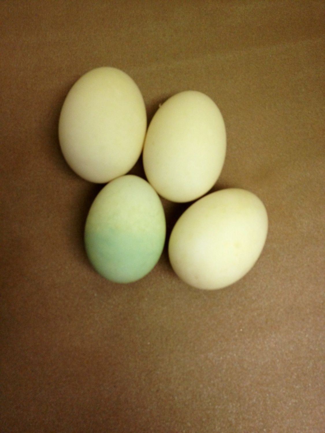 I think they normally do lay white eggs but the woman I got them from said they were a kids classroom project the parents that is and there was mix one so it is possible they might all be mix but look like a pekin and also there was a couple blue eggs that thy hatched out of so maybe it's normal maybe they r a bit if a mix