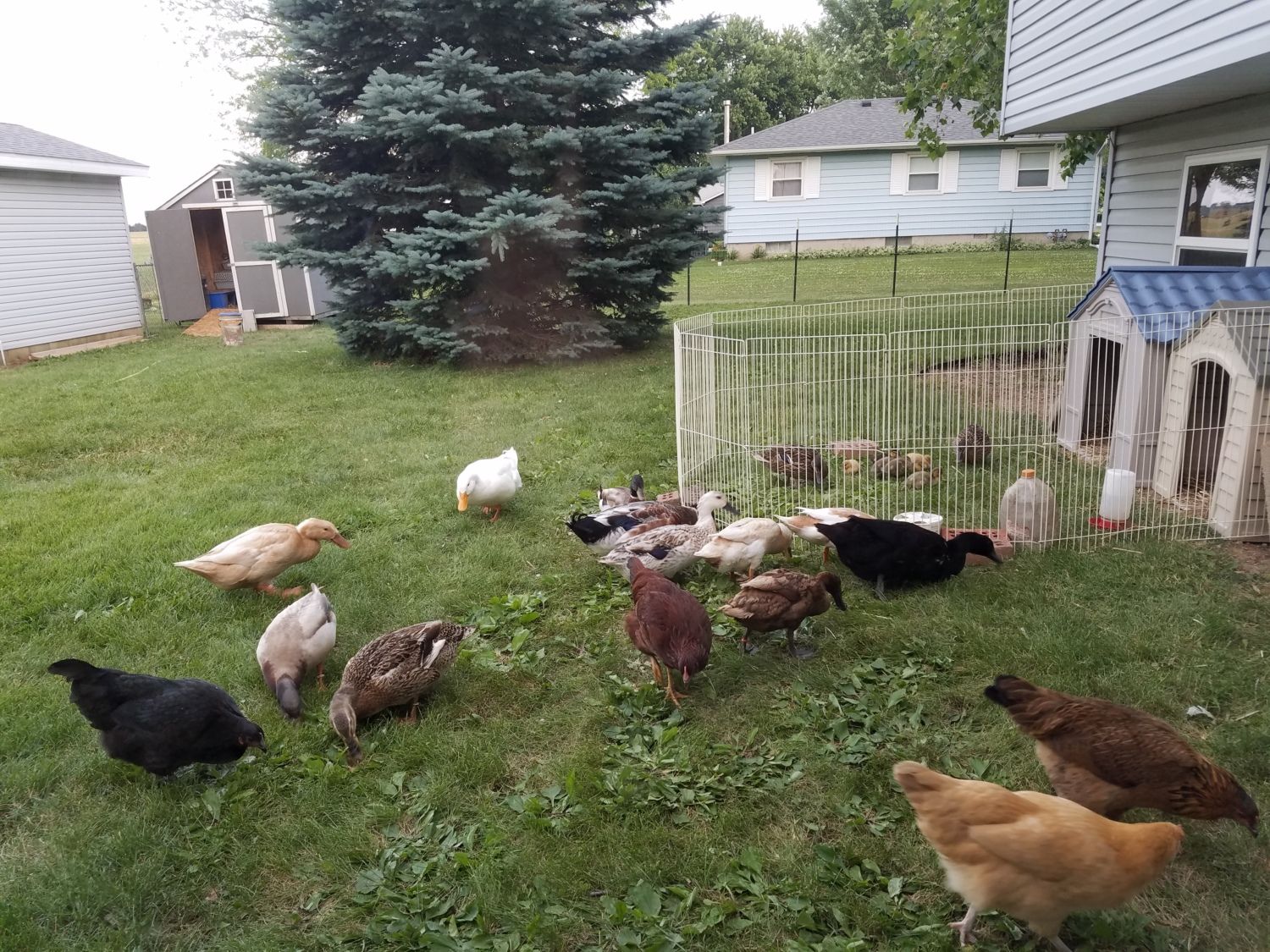 Holy moly. All my ducks are moved over to our new house. Getting those two mama mallards and their week old babies was just the worst experience ever. I got bit, scratched and pooped on. Ugh. But everyone is happy and moved in to the new yard...except the people lol. Still got a lot to move!