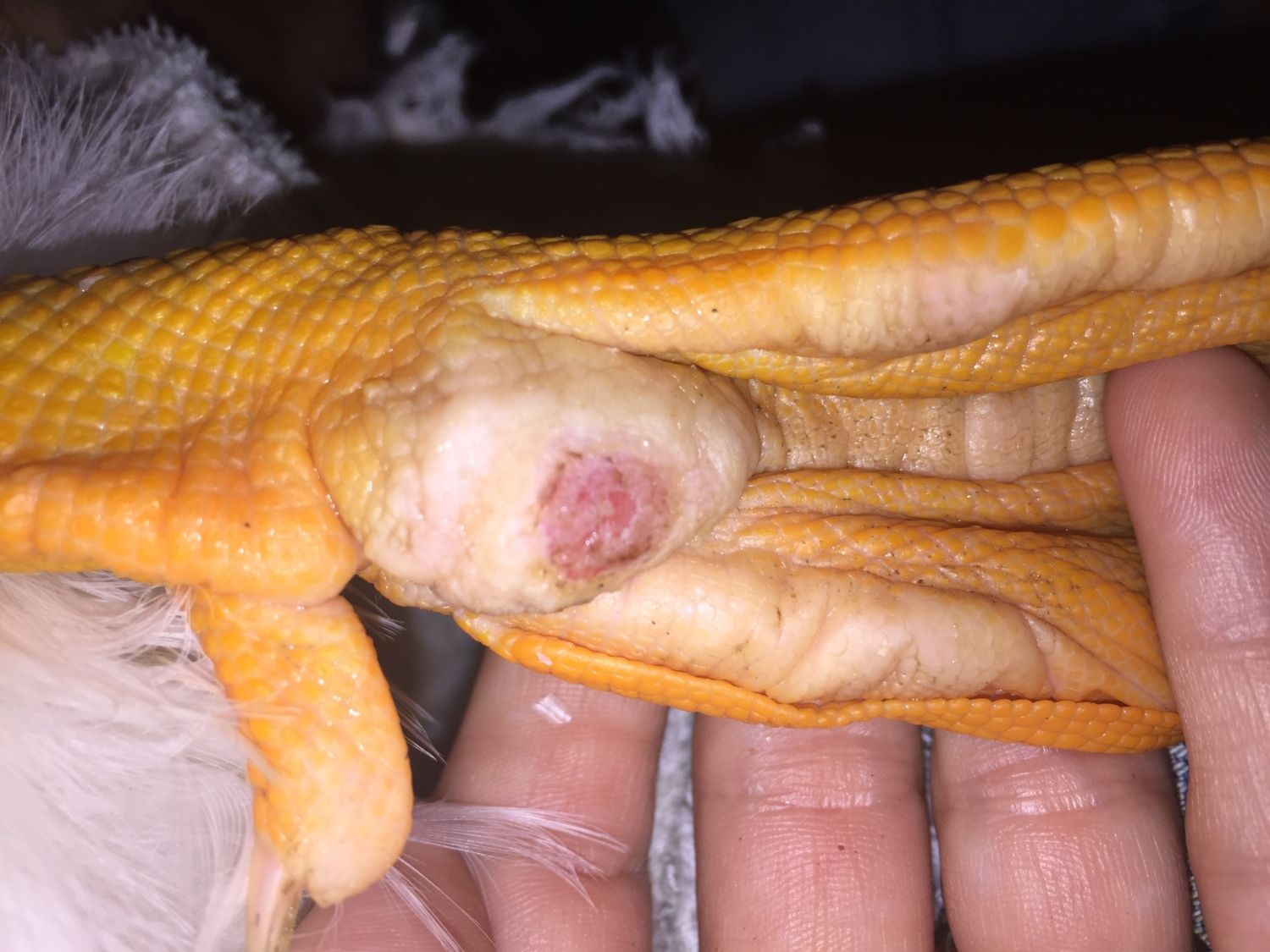 Here's an updated picture of my Donald's foot from last night. Monday I got home too late to do anything but my DH soaked it in epsom salt and rewrapped it. Last night I pulled a few tiny pieces off but nothing significant and tried squeezing it.